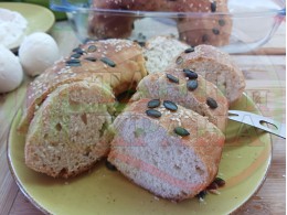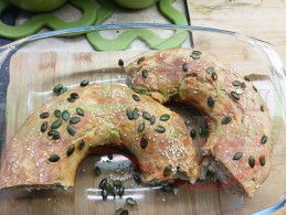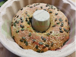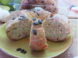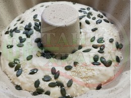 Откъснете около 300 гр. от втасалото тесто, оформете го на средно дебел "фитил" и го завийте около намазана със слънчогледово олио форма за печене на кексове. Поръсете хляба с тиквените семки и сусама и леко притиснете семките за да се захванат за тестото. Покрийте хляба с кърпа, с част от хартията или найлонов плик и го оставете на топло за около 30 минути докато втаса повторно и удвои обема си (при топла кухня не покривайте хляба). Поставете формата за кекс с хляба в предварително загрятата фурна (загрейте я за поне 5 минути). Запечете на фурна без вентилатор на 180 градуса за около 50 минути.
