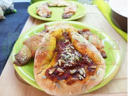 Микс от хлебчета "Лютенични слънчогледовосемкови сусамени постни" изпечен на фурна с плънка от едросмляна лютеница слънчогледови сурови семки и сусам омесен с бяло брашно и суха мая подходящи за постещи хора
