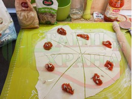 Поръсете работния плот с брашно, откъснете малка част от втасалото тесто и я разточете на средно дебела кора (с по-тънка кора се получават по-хрупкави и сочни хлебчета). Разрежете кората на триъгълници, поръсете ги с олио и сипете по половин супена лъжица лютеница в широкия край на триъгълниците. Поръсете слънчогледови семки върху лютеницата, навийте триъгълниците, така че да не изпадне плънката и ги подредете в намазана със слънчогледово олио тава за печене.