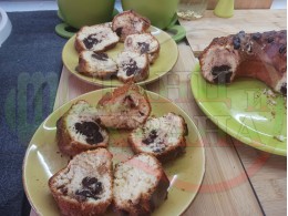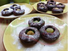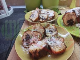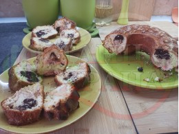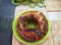 Кекс "Какаоволокумен златностафиден" приготвен с яйца, брашно, прясно мляко, кристална захар и какао с плънка от златни стафиди и локум с мед, орехи и канела