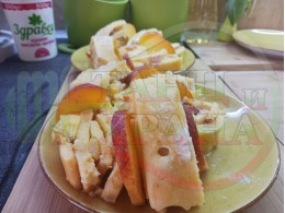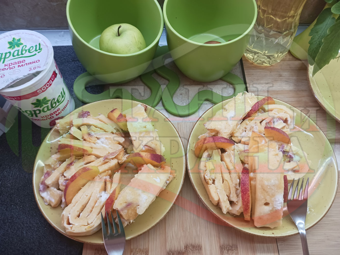 Палачинково плодово сладко руло "Прасковеномлечно" омесено с яйца и прясно мляко изпечено на фурна с пресни праскови гарнирано с пудра захар, канела и кисело мляко от България
