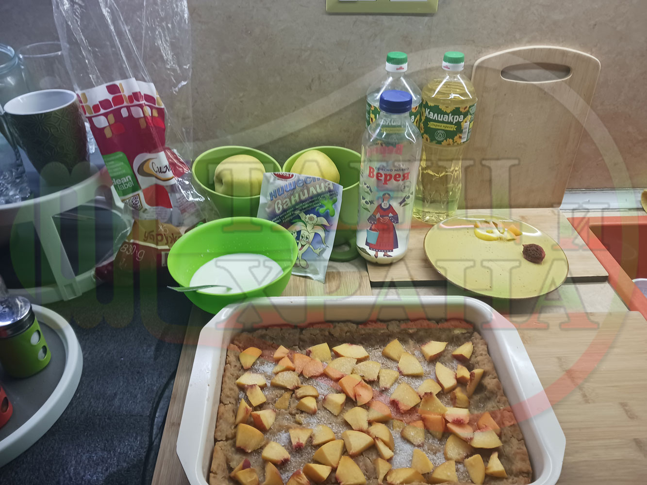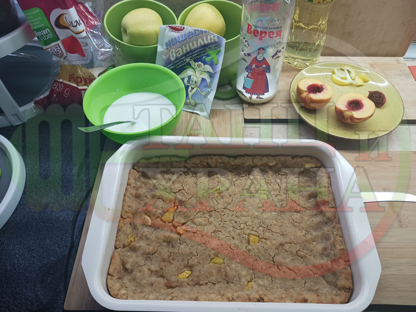 Хлебна плодова пита "Прасковорехи" омесена от хляб с билков чай от липа, прясно мляко и лимонова кора изпечена на фурна с плънка от ванилово нишесте с пресни праскови и сурови орехи