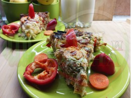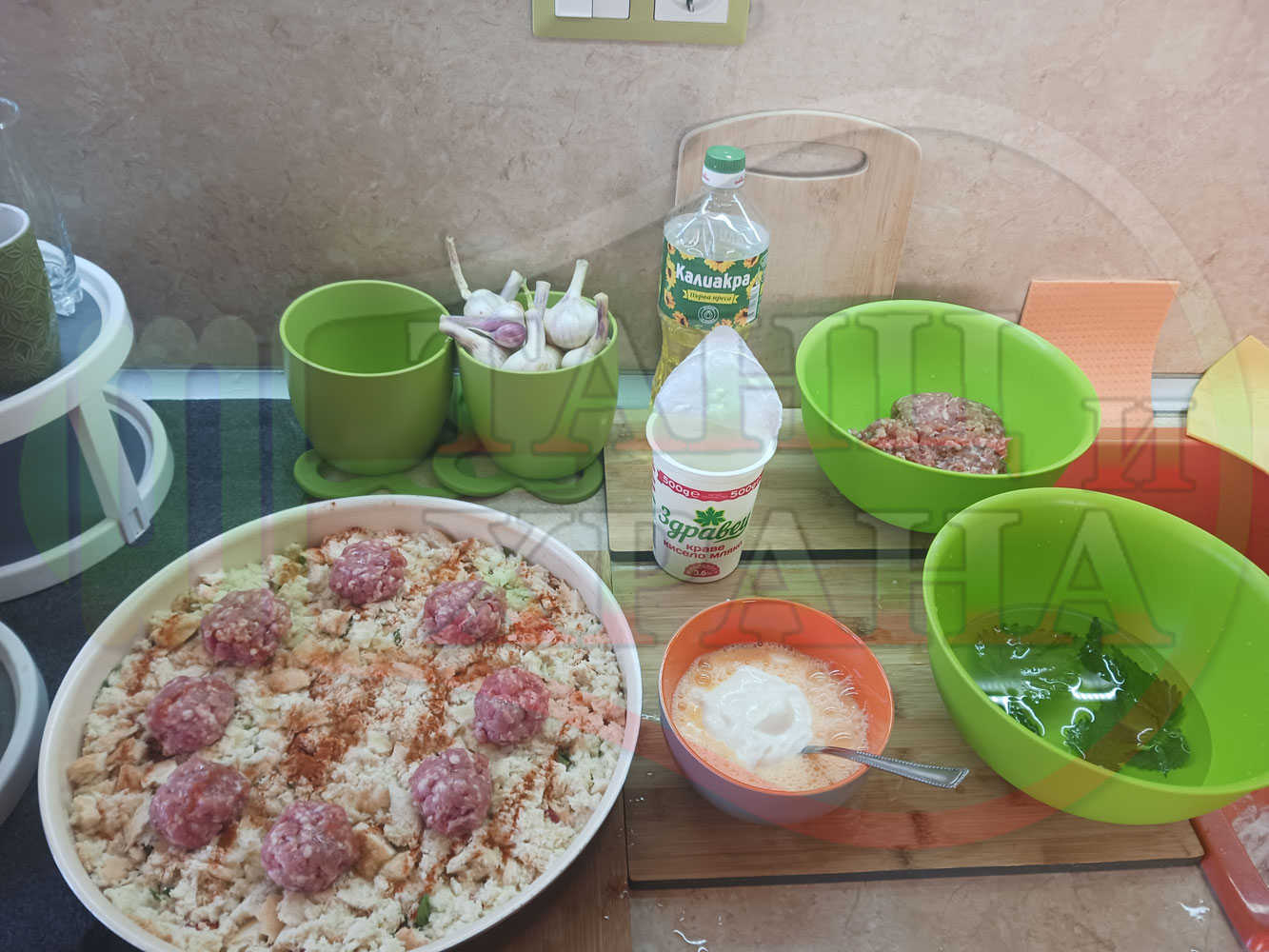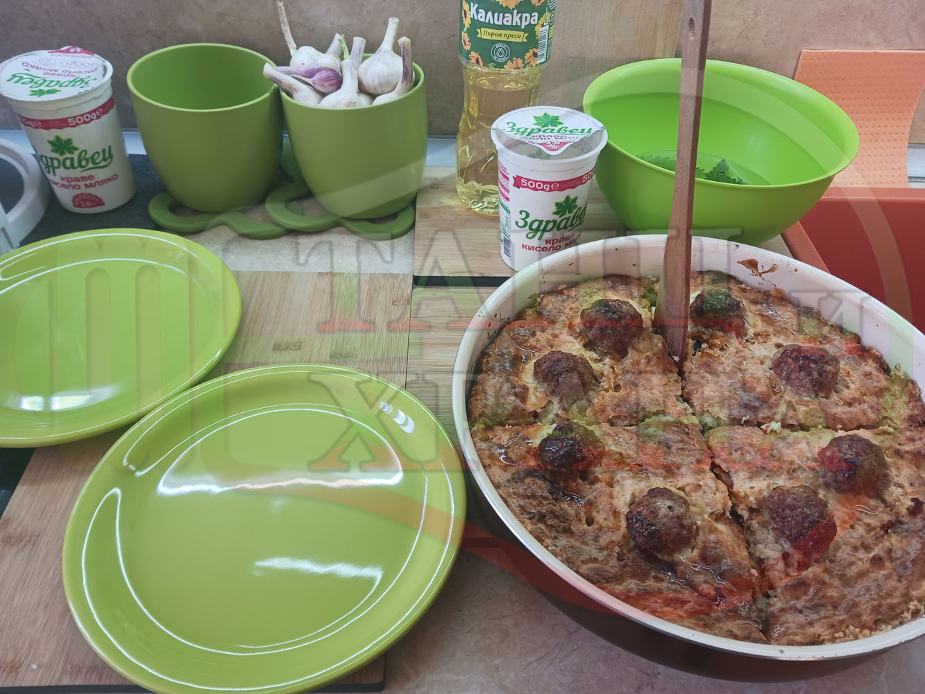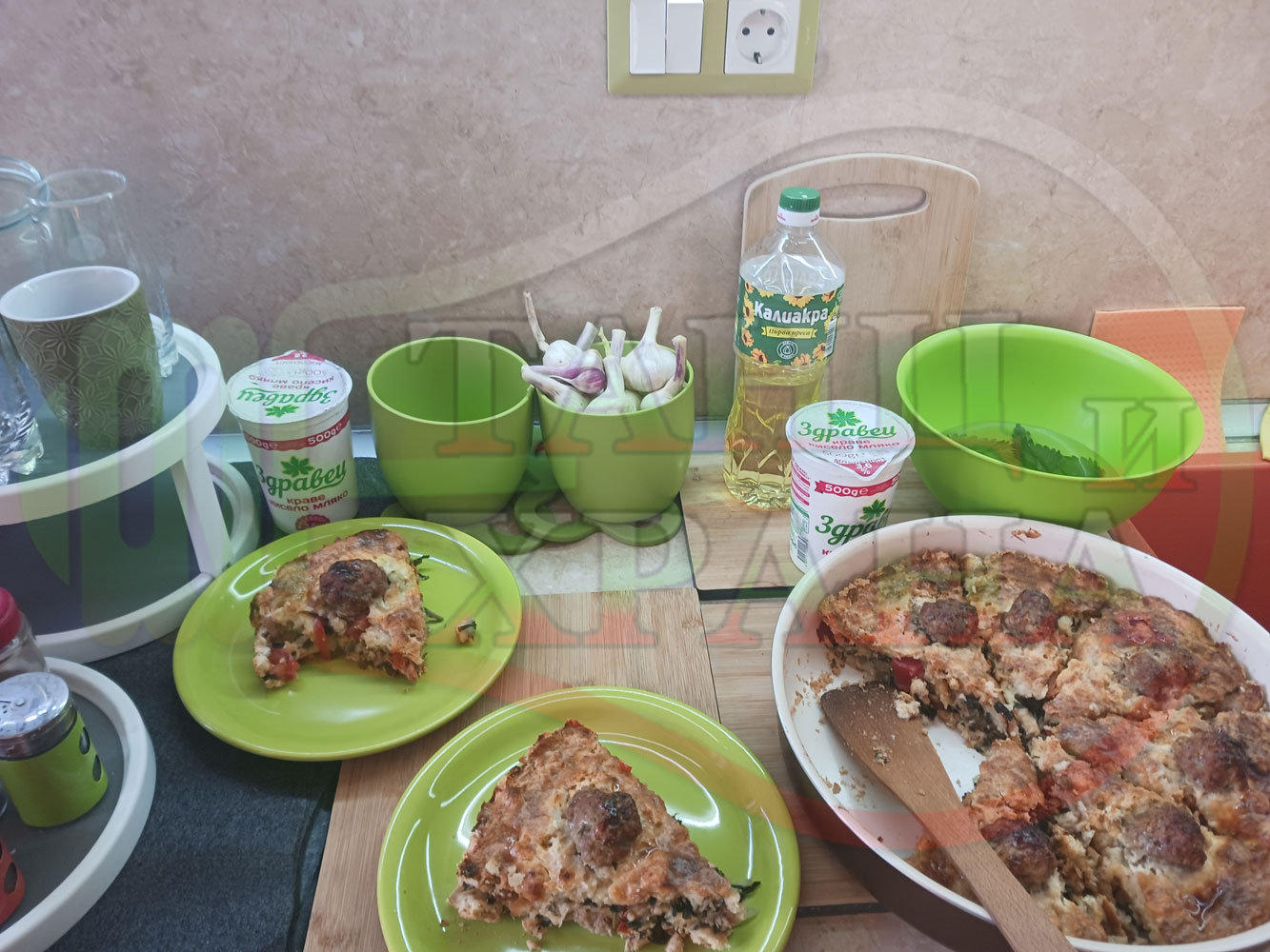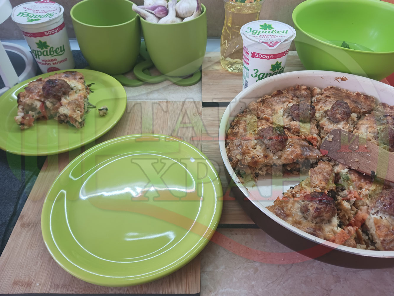 Многопластова хлебна баница с кайма "Каймяни кюфтенца с коприва" запечена на фурна със свежа коприва, домати, кромид лук, стар чесън, червен сладък пипер и яйчено млечна заливка с кисело мляко от България
