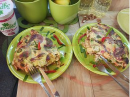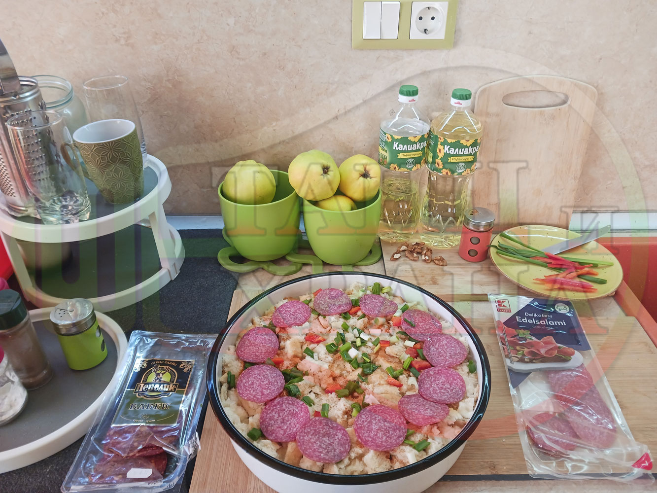 Хлебна баница "Бабековокраставична с червени чушки" запечена на фурна с колбасов бабек, пресен лук, червени пресни чушки, краставици, червен сладък пипер, кисели краставички и салам с яйчено млечна заливка с кисело мляко от България