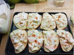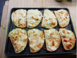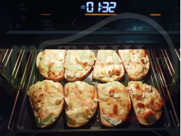 Поставете тавата с подредените филийки в предварително загрятата фурна (загрейте я за поне 5 минути. Запечете на фурна без вентилатор на 180 градуса за около 20 минути.