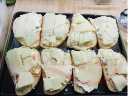 Сипете слънчогледовото олио в тънка тава за печене и го размажете равномерно по тавата чрез накланяне или с четка. Подредете филийките хляб в тавата, намажете ги с масло и разпределете равномерно количество от нарязаното краве бяло сирене на различни по големина парченца (пълното размазване на маслото по филийките не е строго задължително). Поръсете червен сладък пипер върху сиренето и добавете равномерно количество от нарязания кашкавал върху всяка филийка.