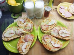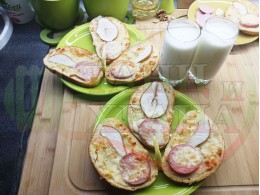Български филийки "Кашкаваленокрушови камчиевосаламени" запечени на фурна с краве масло, пикантен чеснов салам и плънка от кашкавалено крушов крем с млечен кашкавал и пресни круши