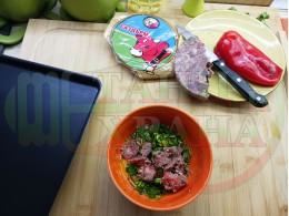 Спретнах превъзходни, хрупкави филийки, запечени на фурна с яйчено саздърмова плънка, приготвена с яйца, деликатесна саздърма, червени пресни чушки, магданоз и чесън. Ммммм... в кухнята се носи аромат на запечено краве масло и леко карамелизирани червени пиперки в идеална хармония със соковете на саздърмата. Отново се получи невероятна вкусно, вкусна, вкусотия (вкуснотия). ![]()