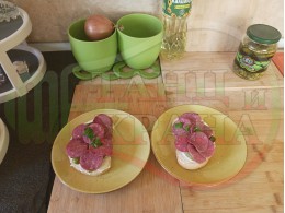 ПРОДУКТИ: Приблизителни количества за препечени на тостер филии с майонеза, кисели краставички и салам