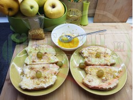 Сладки филийки "Гроздовомедни пчелноцветни" запечени на тостер намазани с масло и гроздов медено пчелен крем приготвен от прясно грозде, липов мед и пчелен цветен прашец поръсени с канела и гарнирани с гроздови зърна