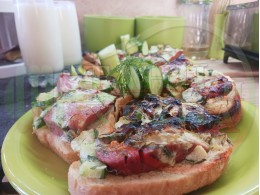 Филийки "Суджуковоманастирски краставичнокашкавалени" запечени на фурна с пресни краставици, манастирски суджук, краве масло и млечен кашкавал поръсени с червен сладък пипер и черен пипер гарнирани с люти чушлета