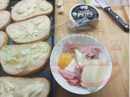 ПРОДУКТИ: Приблизителни количества за филийки "Шункови кромидлучени кашкавалени топеносиренови" запечени на фурна с масло, кромид лук и плънка от яйца, топено сирене, шунка и млечен кашкавал