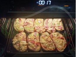 Разпределете равномерно количество от плънката върху филийките, така че да покрива кората на филийките и поставете тавата в предварително загрятата фурна (загрейте я за поне 5 минути (може да не покривате напълно кората на филийките)). Запечете на фурна без вентилатор на 180 градуса за около 15 минути.