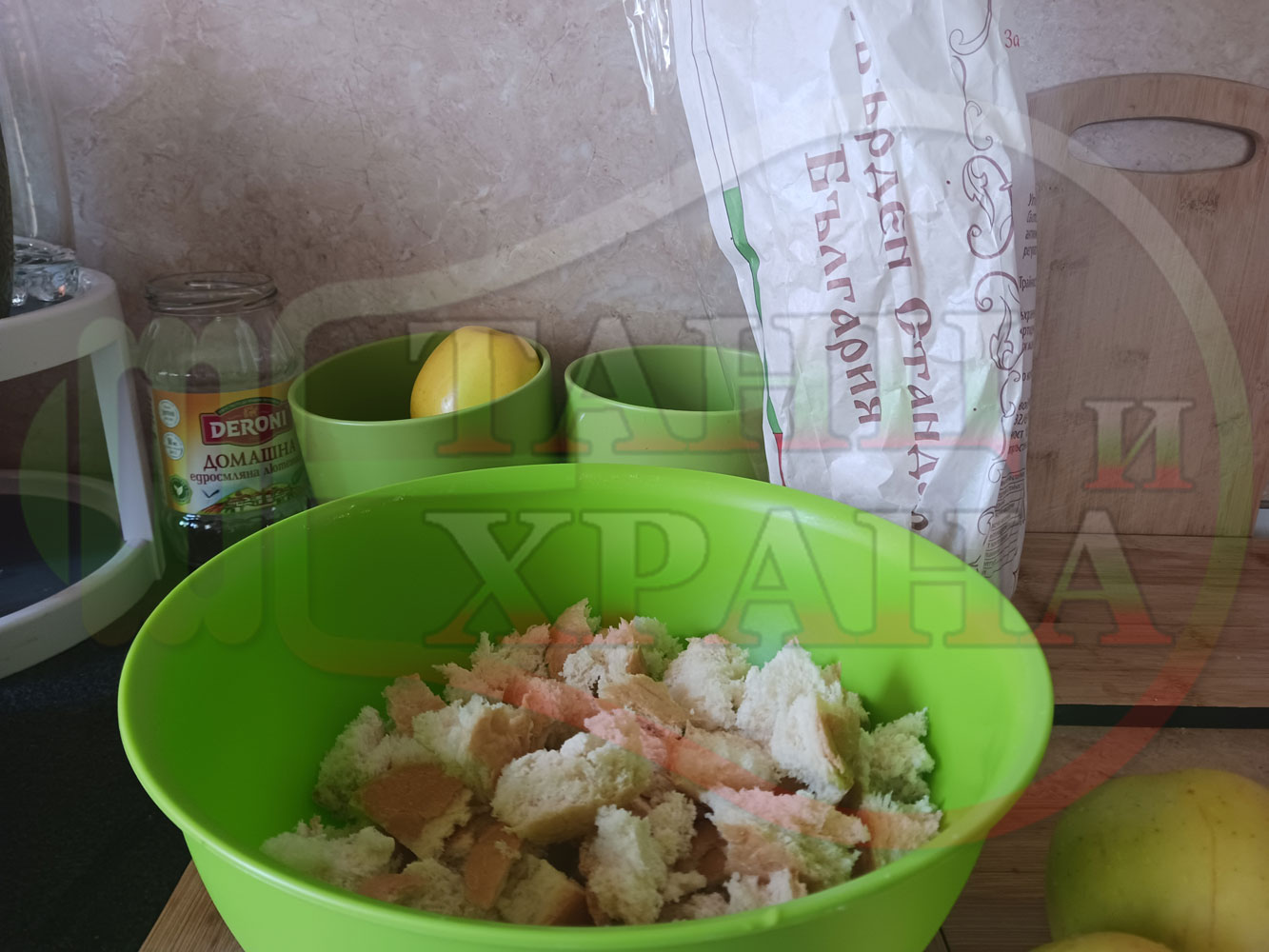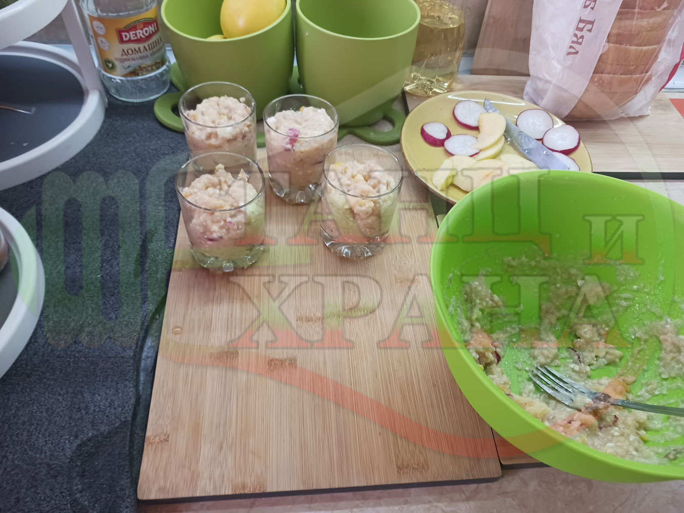 Надробете хляба в купа. Измийте и нарежете ябълката на малки парченца и на няколко резена за украса. Сипете захарта. Разбъркайте и намачкайте с вилица до образуване на средно гъста смес. Измийте и нарежете малките репи на малки парченца и една ряпа на кръгчета за украса. Разбъркайте и намачкайте с вилица като загребвате от дъното на купата за да не останат сухи и нехомогенизирани парченца хляб. Добавете киселото мляко и отново разбъркайте. Добавете кравето бяло сирене. Разбъркайте и намачкайте до образуване на средно гъста хомогенна смес.