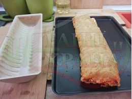 Сипете слънчогледовото олио във форма за печене на рула и намазнете формата. С част от хлебното тесто покрийте дъното на формата. Сипете плънката и я загладете. Покрийте плънката с втората част от тестото. Имайте предвид, че хлебните теста не се разточват лесно и за покриването на плънката може да се наложи да "слепите и споите" тестото чрез малки парченца тесто подобно на мозайка. Поставете тавата във фурната. Запечете на фурна без вентилатор на 180 градуса за около 45 минути.