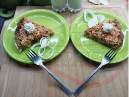 Отрежете по едно парче от тортата и го поставете в центъра на чиниите. Украсете порциите с лучената сърцевина от кромид лука и със зелевите пресни листа (оформете и украсете порциите по ваше желание и усмотрение).