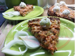 Българска хлебна торта "Зелева филежарена" омесена от хляб с прясно зеле, кромид лук, зелени пресни чушки, жарено филе и кисело мляко от България сурово гарнирана със сиреново зелев крем с червен сладък пипер и краве бяло сирене - двукомпонентна