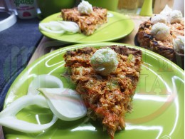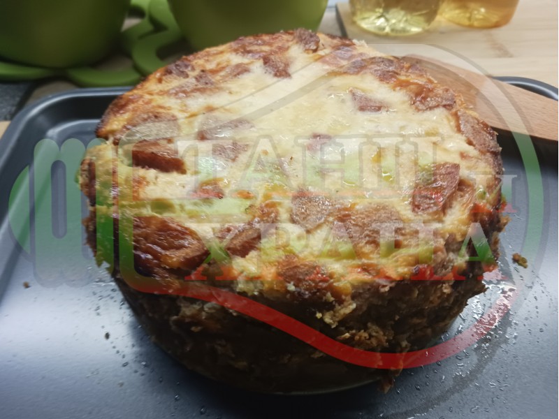 Хлебна солена торта "Колбасова народна с БГмерудии" омесена от хляб с ронена чубрица, червен сладък пипер и лютеница запечена на фурна с плънка от салам, яйца, млечен кашкавал и кисело мляко от България