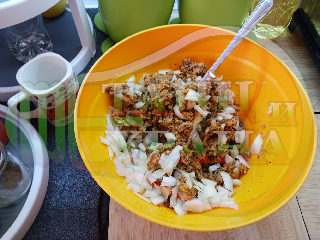 Надробявате хляба в купа. Обелвате, измивате и нарязвате лука на едро върху хляба. Разбърквате с намачкване за да може лука да пусне сок. Добавяте сладкото от кори на портокали и грейпфрут и отново разбърквате с намачкване. Добавяте джоджена, босилека, ронената чубрица и червения сладък пипер. Отново ръзбърквате всички продукти. Добавяте олиото. В отделна купа или чаша сипвате киселото мляко. Оставете поне един пръст разстояние от ръба на съда, в който сипвате млякото за да не прелее при добавянето на содата. Добавете содата за хляб. Разбъркайте до пълно разтваряне на содата и "шупване" на млякото. Добавете ги в  купата с хлебното тесто.
