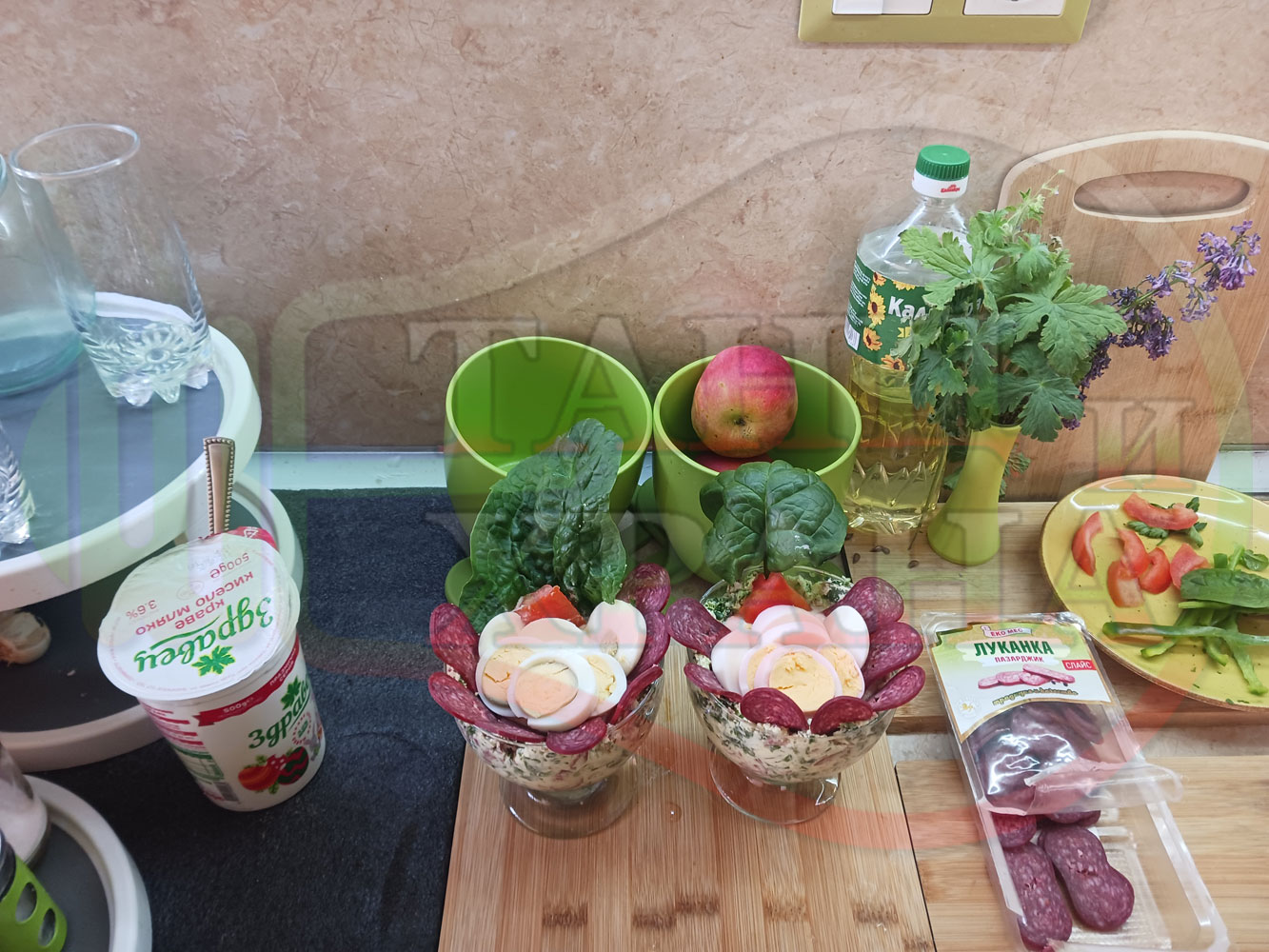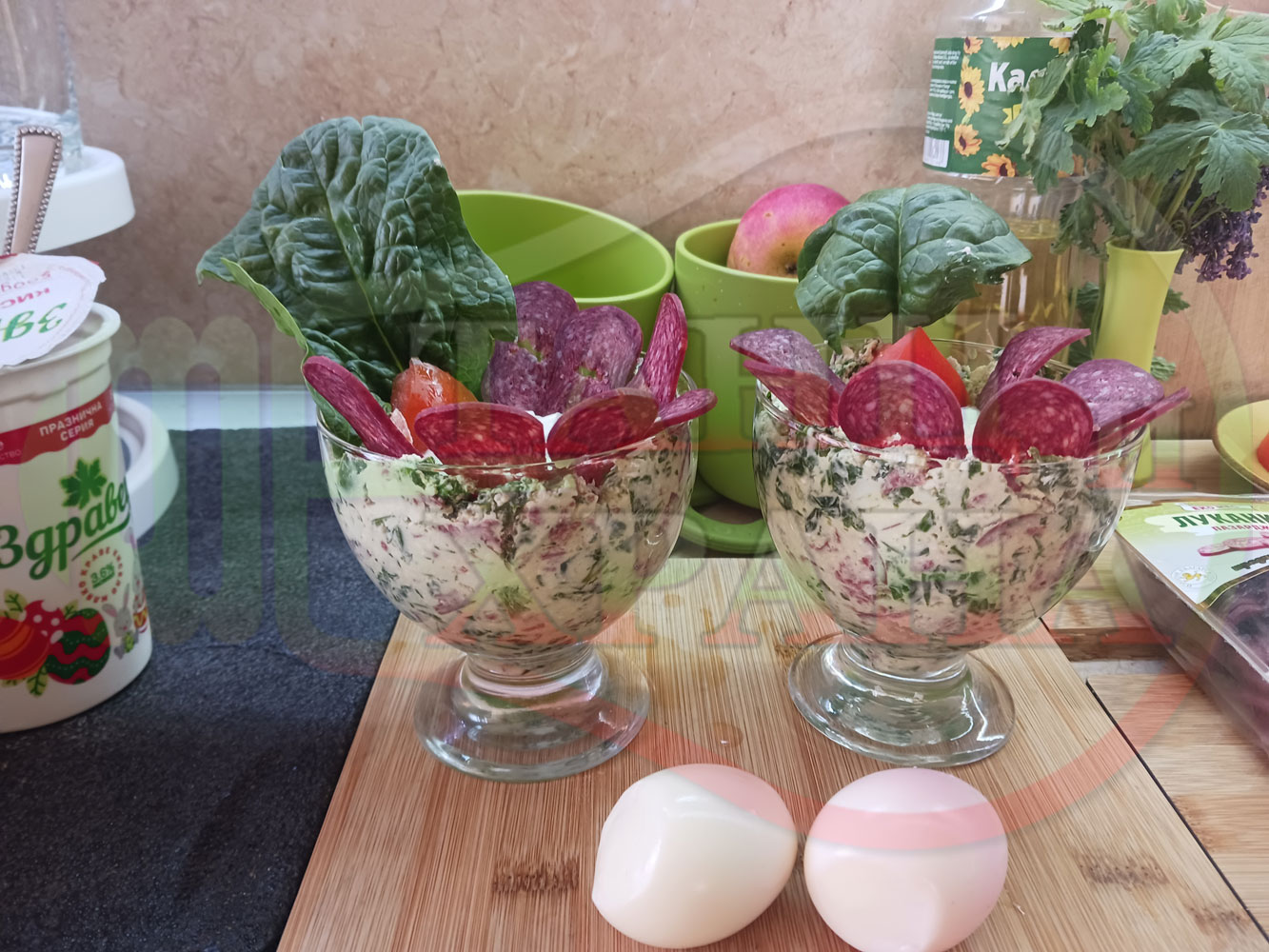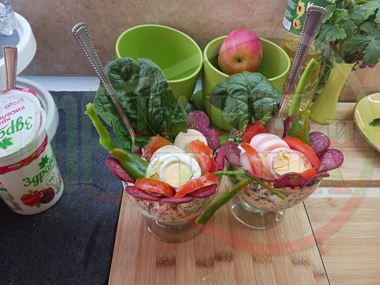 Българска луканкова студена яхния "Спаначенояйчена доматеносиренова с БГсирене" приготвена от спанак, варени яйца, зелени пресни чушки и луканка гарнирана със сиреново магданозен доматен крем и кисело мляко от България - двукомпонентна