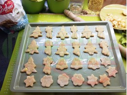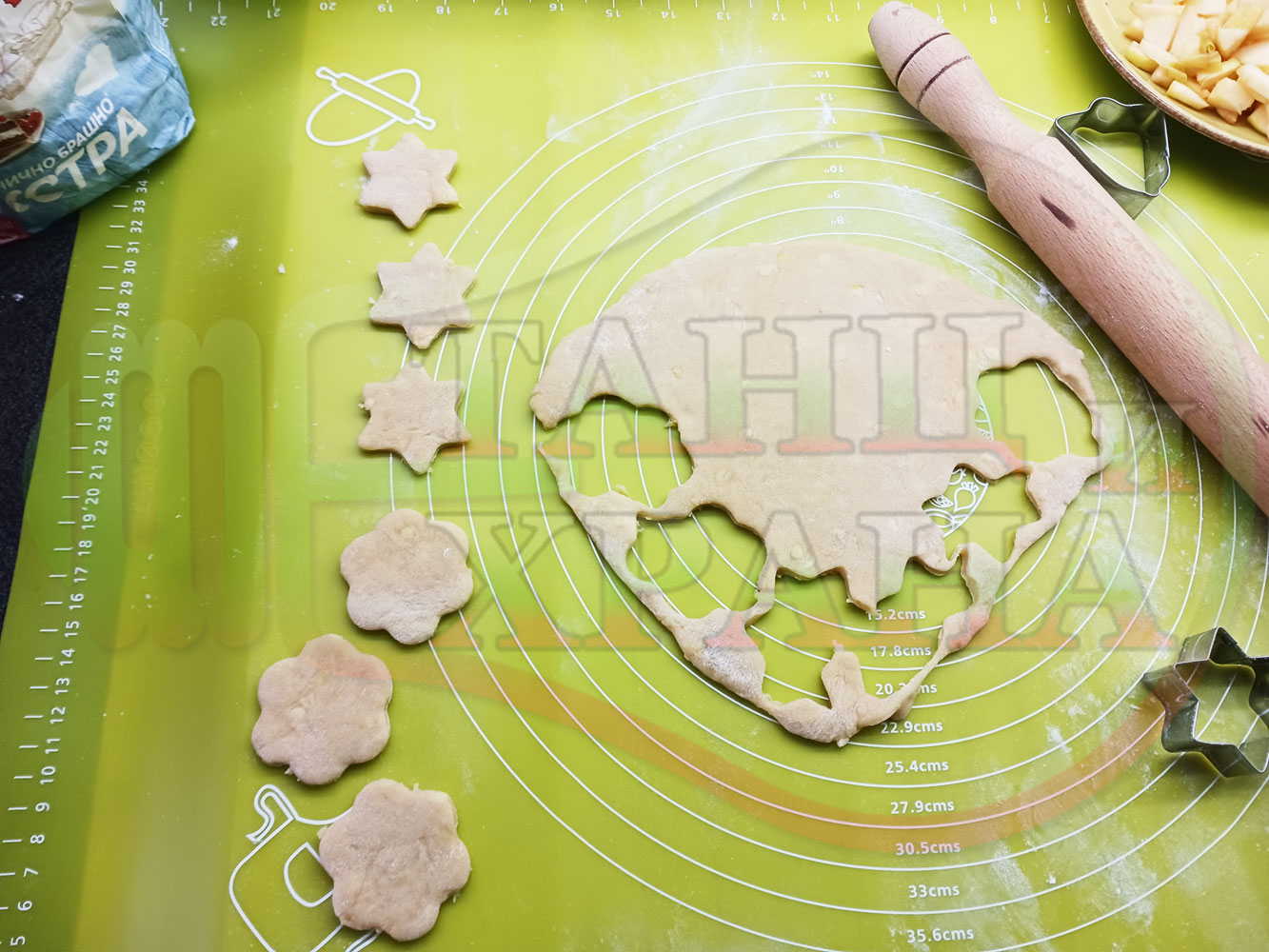 Поръсете с брашно работната площ върху, която ще разточвате. Извадете купата от хладилника и поставете тестото върху поръсената с брашно работна площ (използвайте силиконова подложка за разточване, в случай че имате такава). Разточете тестото до средно дебела кора около 2 см. и оформете различни видове фигурки с метални формички или с малки чашки и други видове кухненски прибори. Съберете отразъците от тестото, които са останали след оформянето на фигурките, размесете го, набрашнете работната площ и отново го разточете и отрежете различни коледни фигурки. Повторете процедурата до пълното оползотворяване на тестото или заделете част от него за последващо изпичане на курабийки или за друг вид коледно печиво. На част от курабийките оформете малки вдлъбнатини с капачка или друг вид подходящ прибор, поставете част от нарязаната на парченца ябълка във всяка вдлъбнатина и поръсете ябълковите парченца с кристална захар.