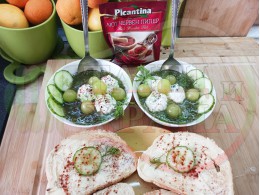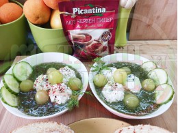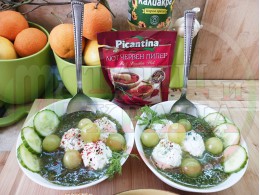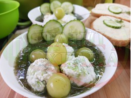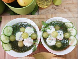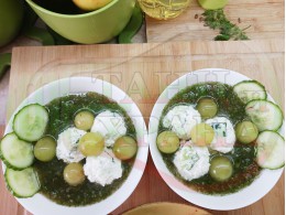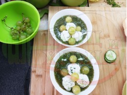 Българска сурова сладко солена супа "Гроздовокопърова сиреновокраставична с БГсирене" приготвена с прясно грозде, краставици и свеж копър гарнирана с топчета от сиреново краставичен крем с краве бяло сирене (българско, саламурено) - двукомпонентна
