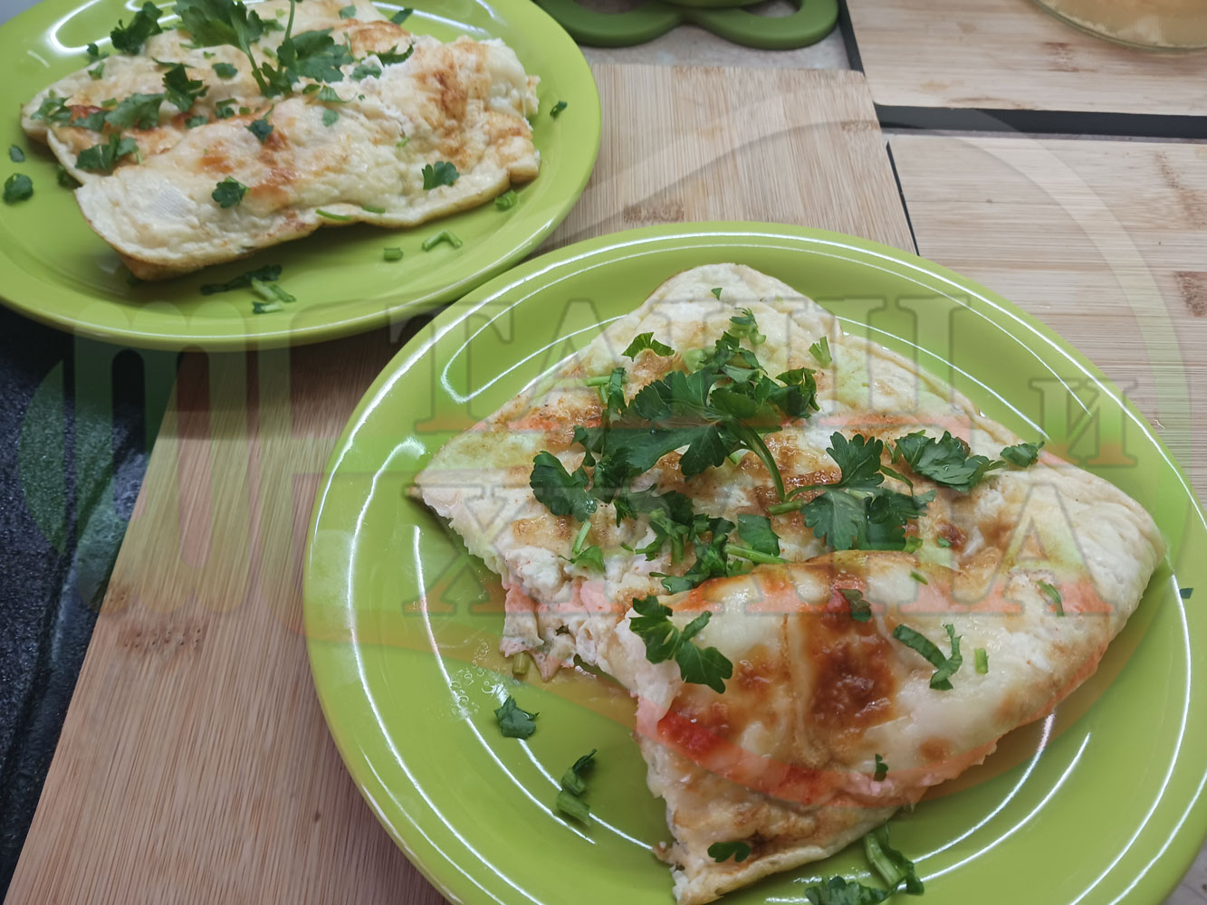 Омлет "Български омлет книга" запечен на фурна с яйца, краве бяло сирене, червен сладък пипер, кашкавал, свеж магданоз и кисело мляко от България