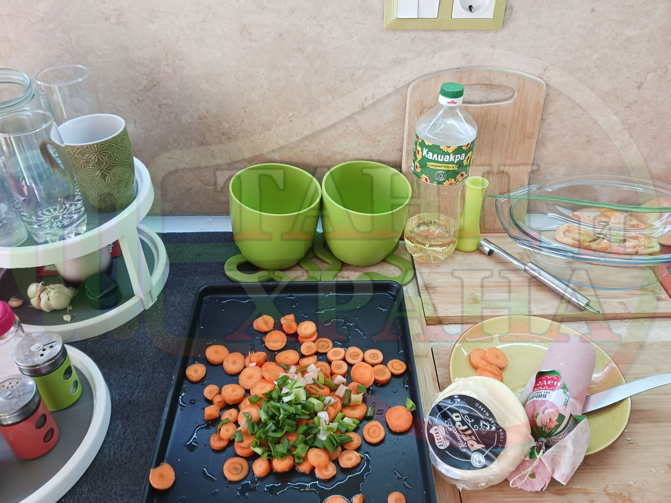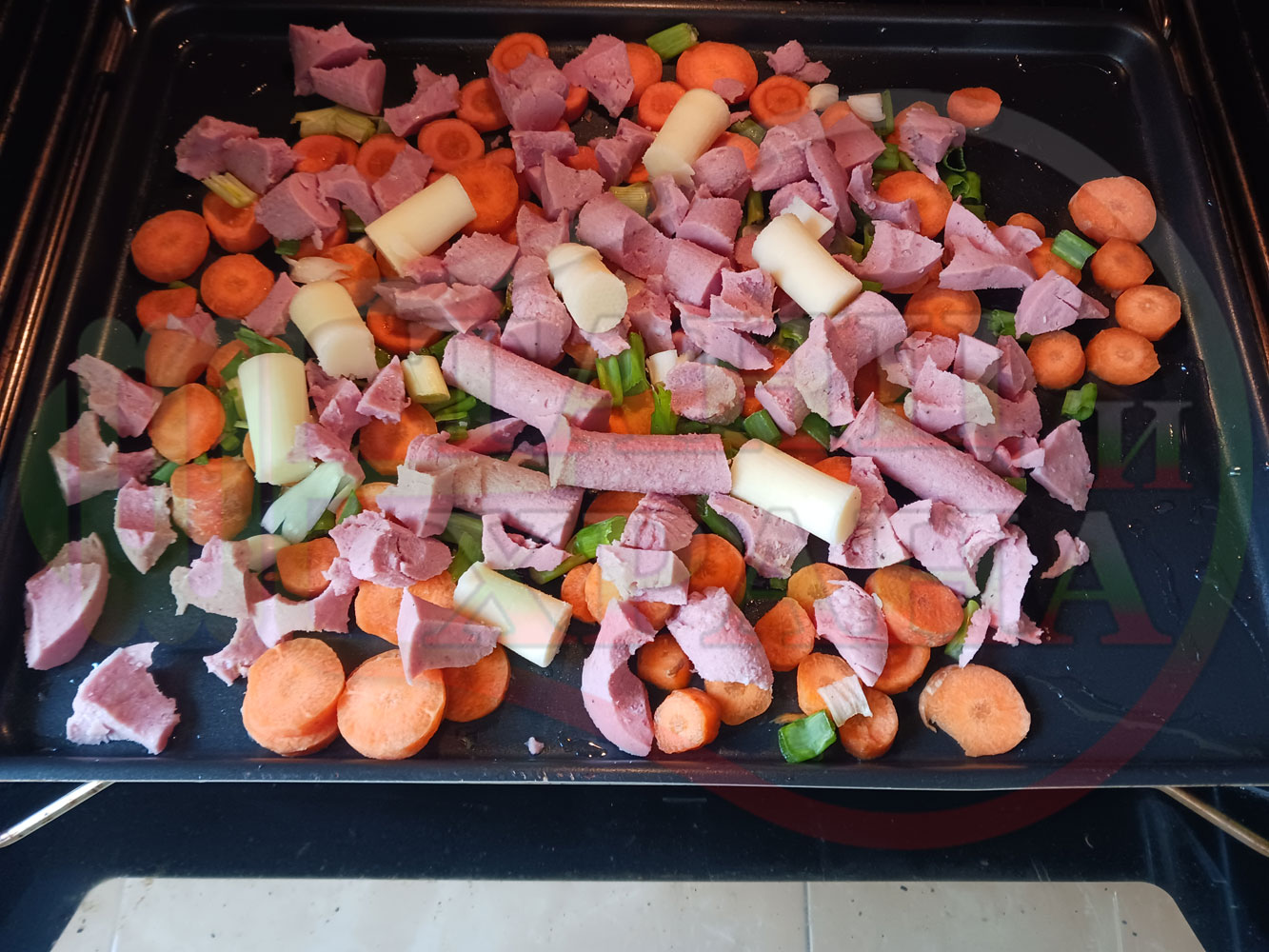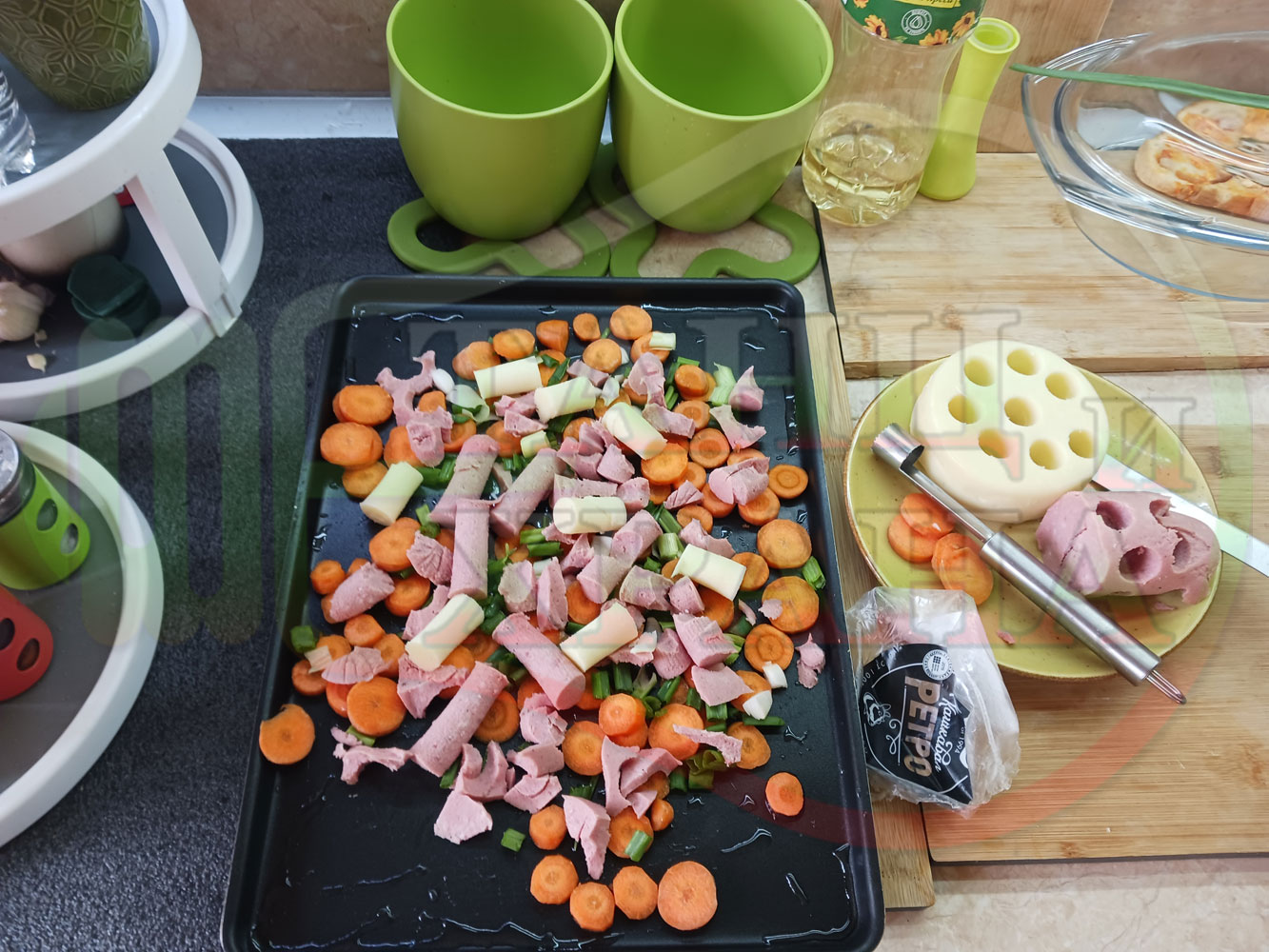 Измийте морковите и пресния лук и нарежете лука на едро а морковите на кръгчета в намазана със слънчогледово олио тава за печене. Обелете салама и кашкавала, оформете част от тях на "цилиндърчета" а останалата част от салама нарежете на малки парченца и ги добавете в тавата. Разбъркайте и поставете тавата в предварително загрятата фурна (загрейте я за поне 5 минути). Запечете на фурна без вентилатор на 180 градуса за около 20 минути.