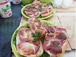 Филийки "Родопсконаденицови кашкаваленомагданозени" запечени на фурна с краве масло, родопска наденица и млечен кашкавал гарнирани със свеж магданоз и кисело мляко от България