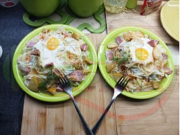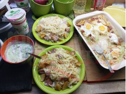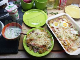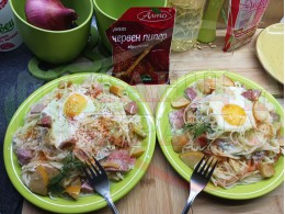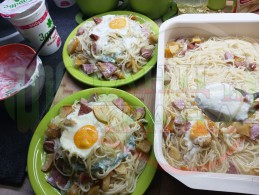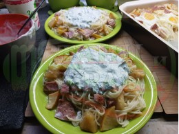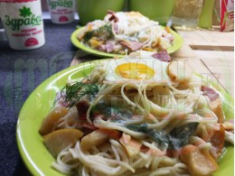 Български спагети "Ябълковояйчени камчиевосаламени киселомлечни" сварени на фурна с пресни ябълки и пикантен чеснов салам запечени с яйца сурово гарнирани с млечен сос със свеж копър, стар чесън и кисело мляко от България