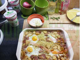 ПРОДУКТИ: Приблизителни количества за български спагети "Ябълковояйчени камчиевосаламени киселомлечни" сварени на фурна с пресни ябълки и пикантен чеснов салам запечени с яйца сурово гарнирани с млечен сос със свеж копър, стар чесън и кисело мляко от България