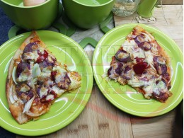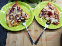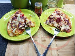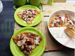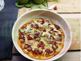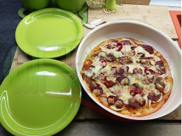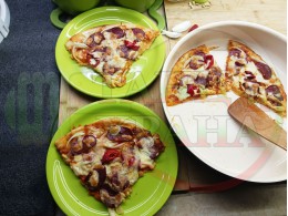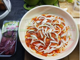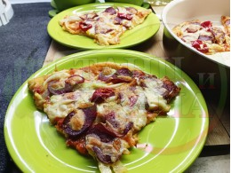 Плоска солена торта "Луканкова кромидлучена червеночушковолютенична кашкавалена" запечена на фурна с луканка, едросмляна лютеница, червени пресни чушки, кромид лук и млечен кашкавал