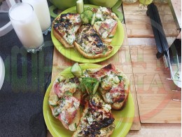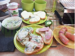Филийки "Родопсконаденицови краставичнокопърови киселомлечни" запечени на мини скара с родопска наденица и краве масло с яйчено млечна плънка от яйца, свеж копър, чесън и кисело мляко от България
