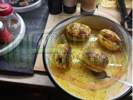 Картофите се получиха изключително вкусни и ароматни, ухаещи на български подправки и мерудии. Чесново ореховата смес ги овкусява при запичането и обогатява вкуса с леката едва доловима млечна "мазнинка" на ореховото масло. Как да не си хапнем пълнени картофи като предястие или гарнитура към някое ястие... с хлебни кюфтета "Краставичновинени".