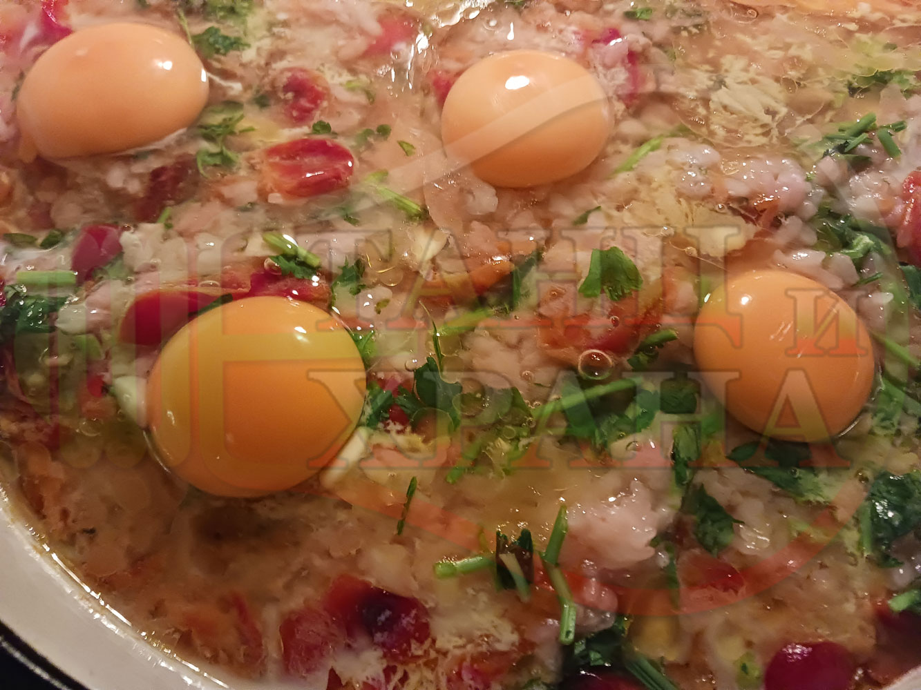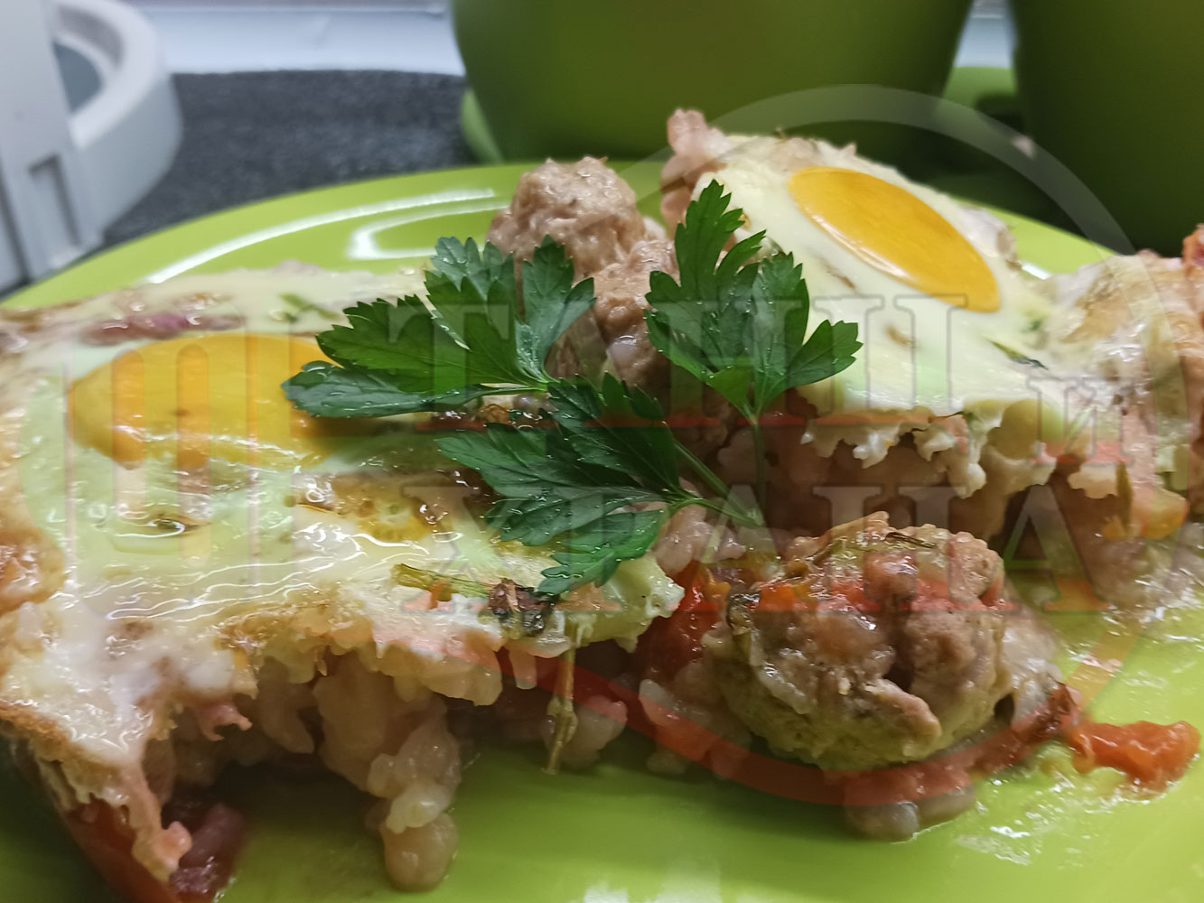Ориз със сливи тип червена джанка с мини кюфтенца от кайма и мини кюфтенца от картофено пюре с кисело мляко, гарниран с яйца