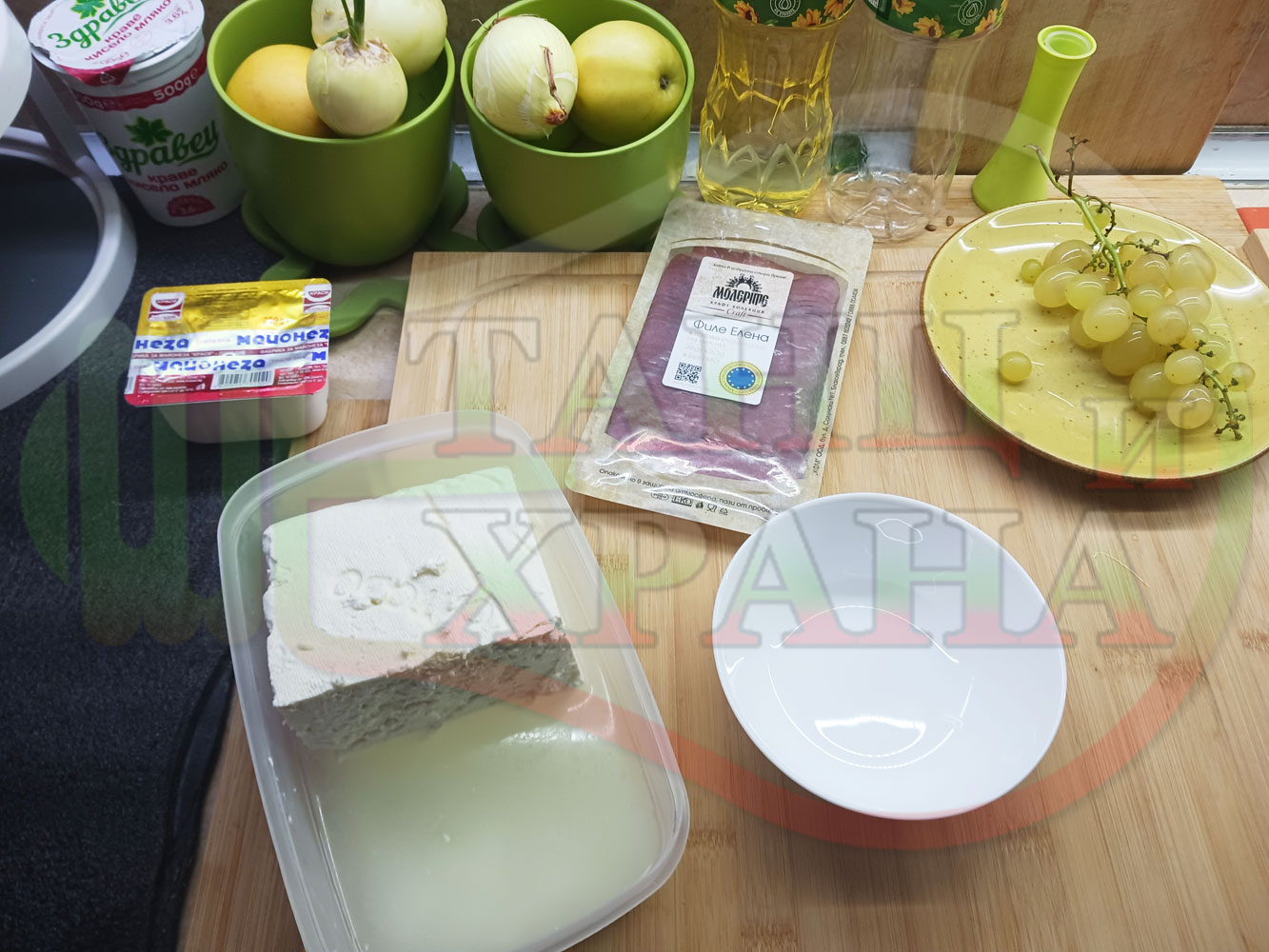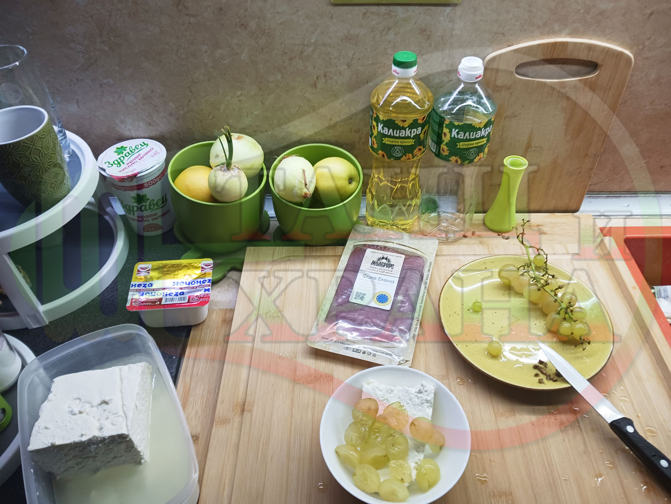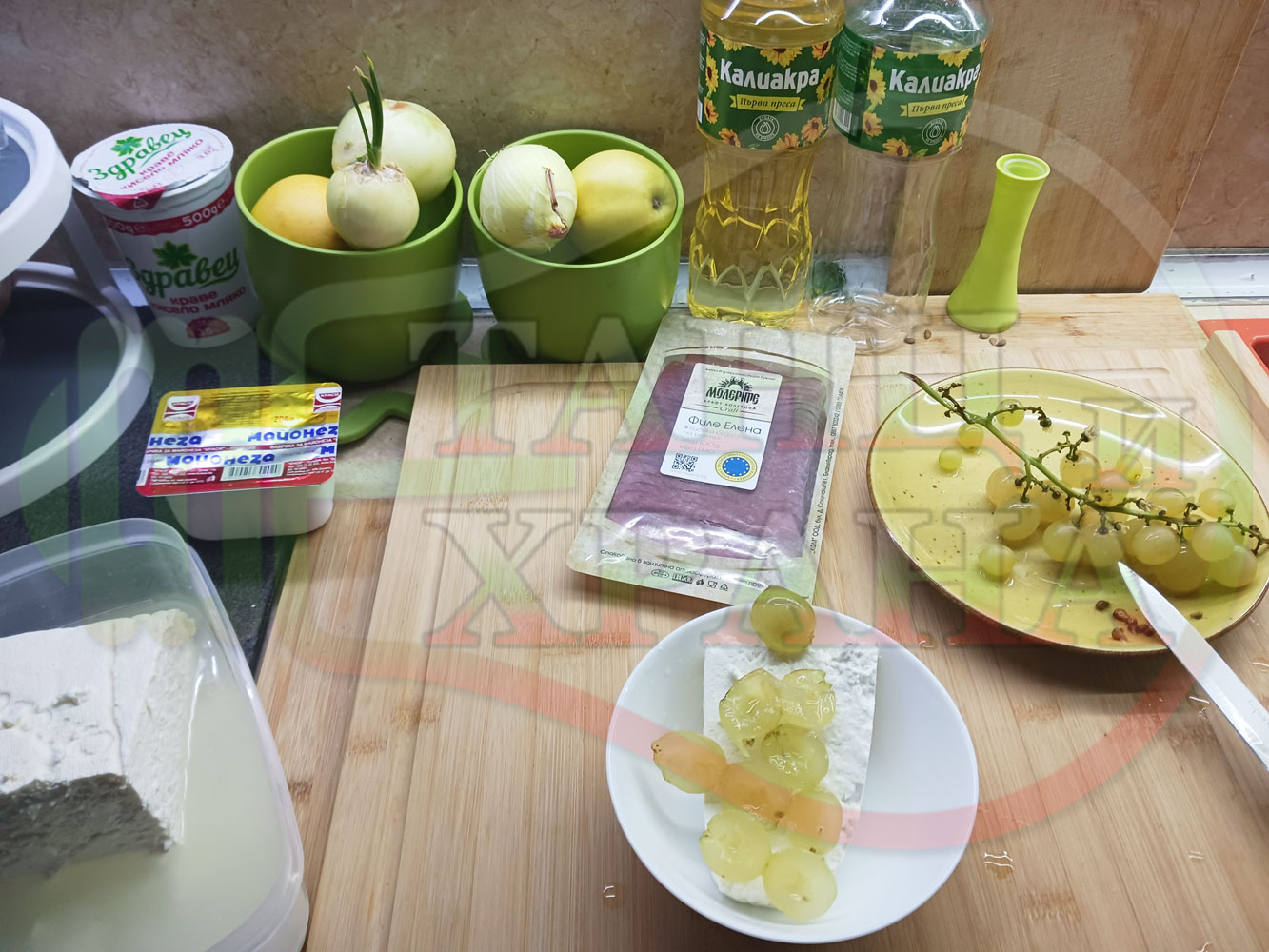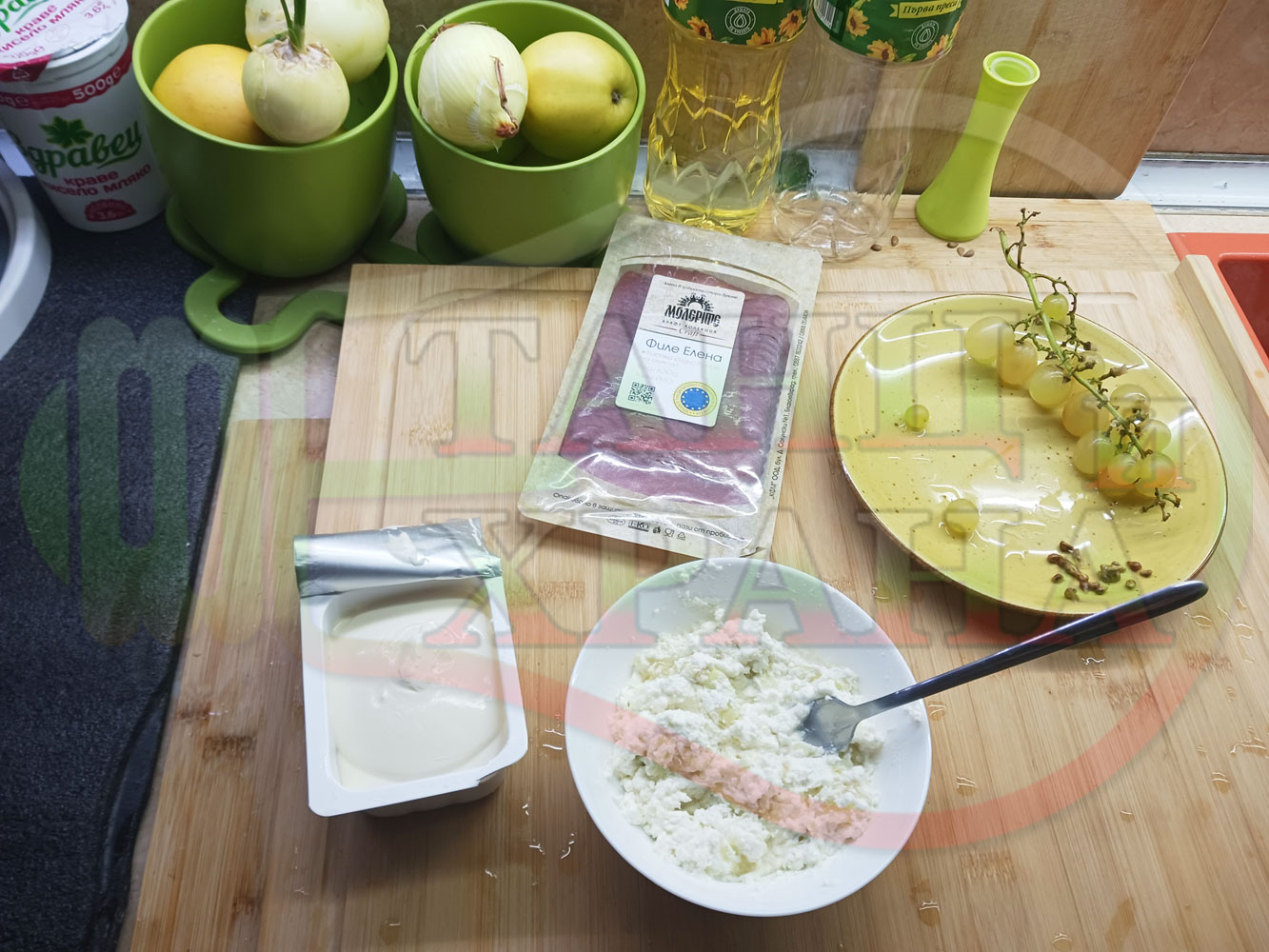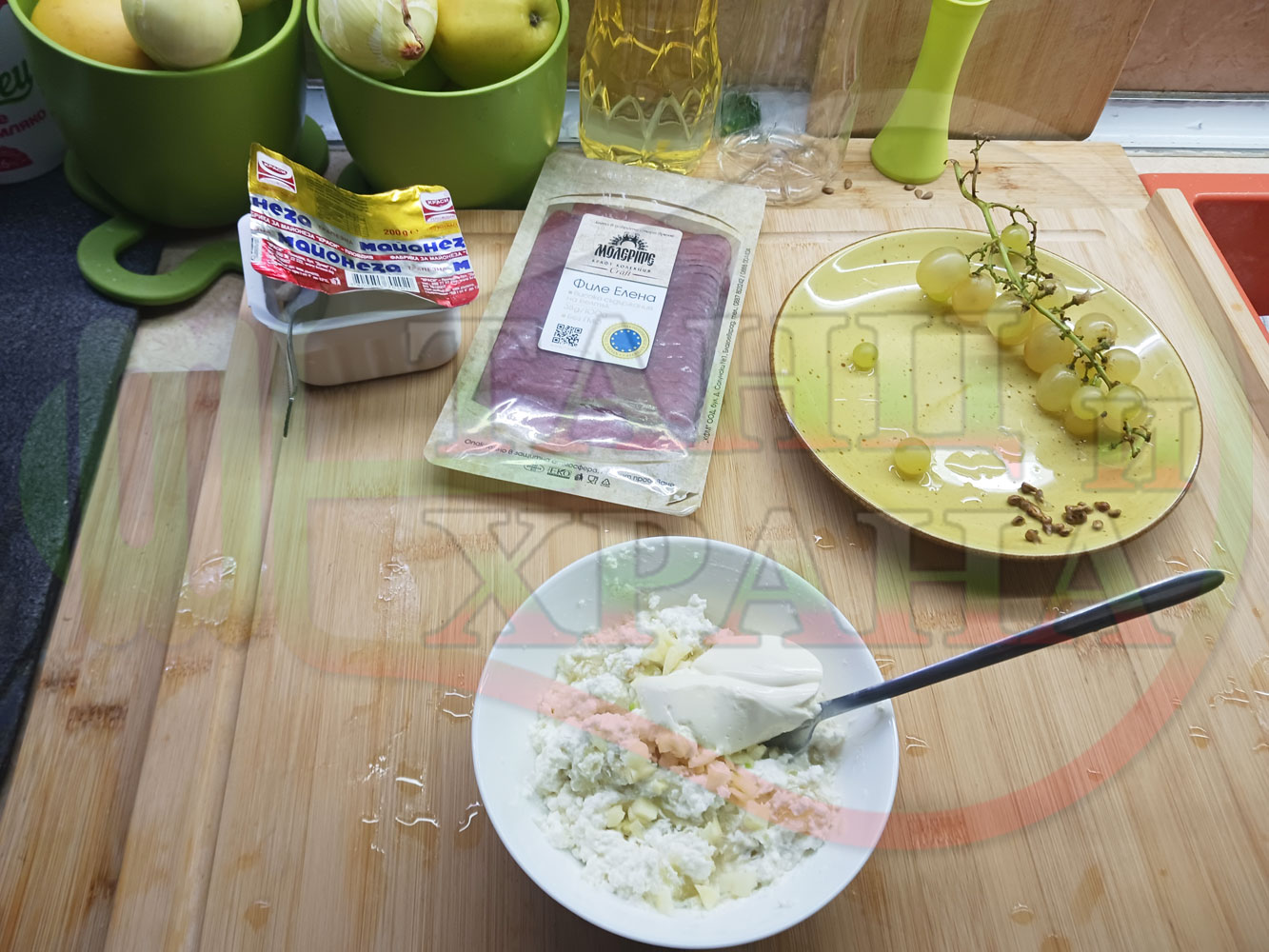 ПРОДУКТИ: Приблизителни количества за българска гроздова сурова салата "Филееленова майонезена с БГсирене" приготвена с прясно грозде, чесън, майонеза и краве бяло сирене (българско, саламурено) оформена като основа от сиренов крем гарнирана с филе елена - двукомпонентна