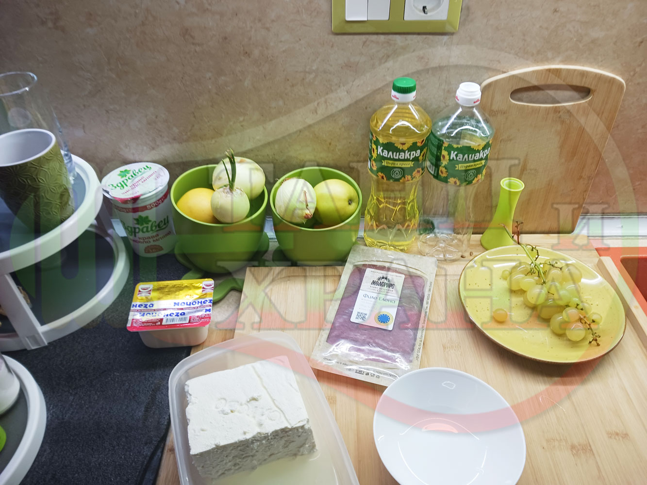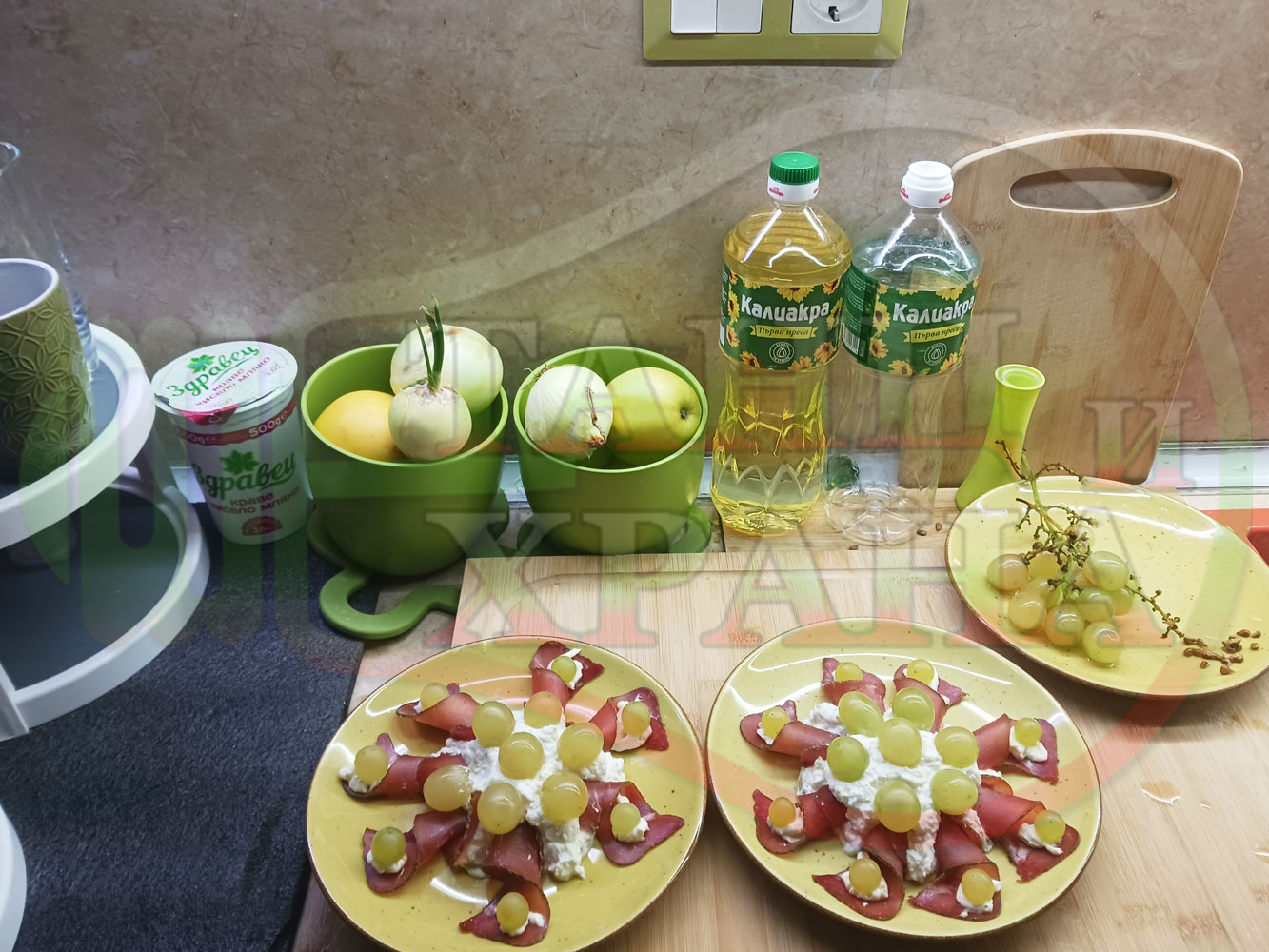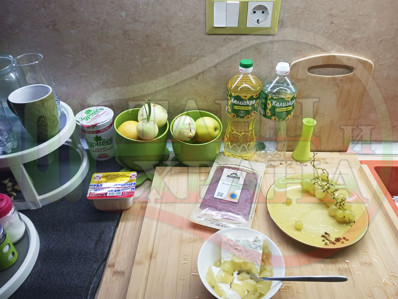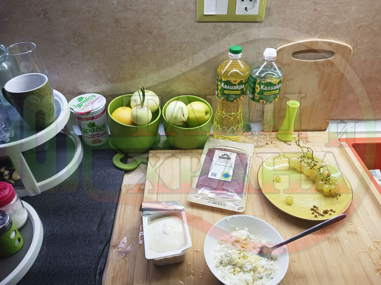 ПРОДУКТИ: Приблизителни количества за българска гроздова сурова салата "Филееленова майонезена с БГсирене" приготвена с прясно грозде, чесън, майонеза и краве бяло сирене (българско, саламурено) оформена като основа от сиренов крем гарнирана с филе елена - двукомпонентна