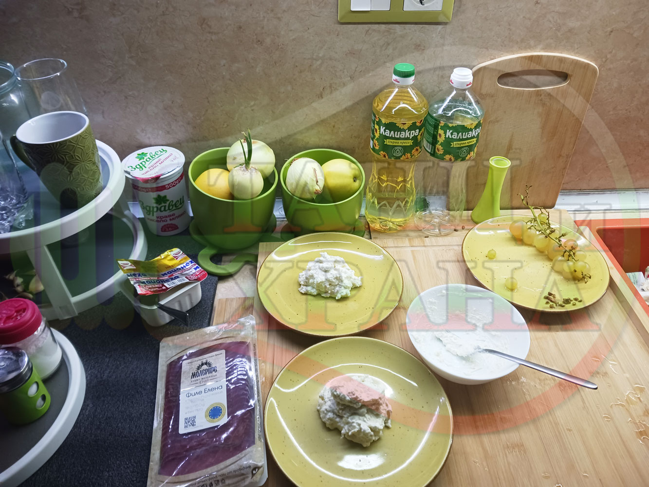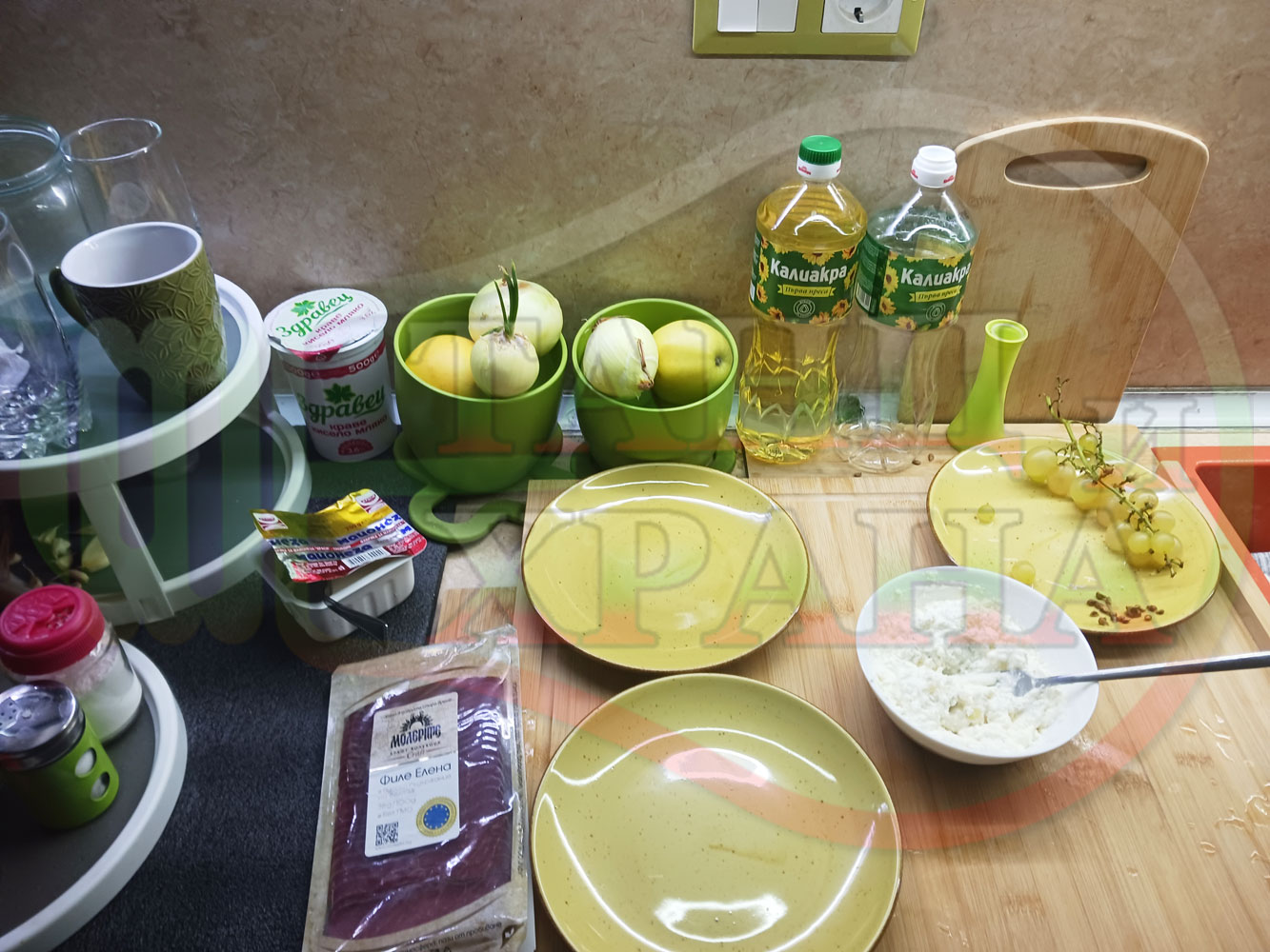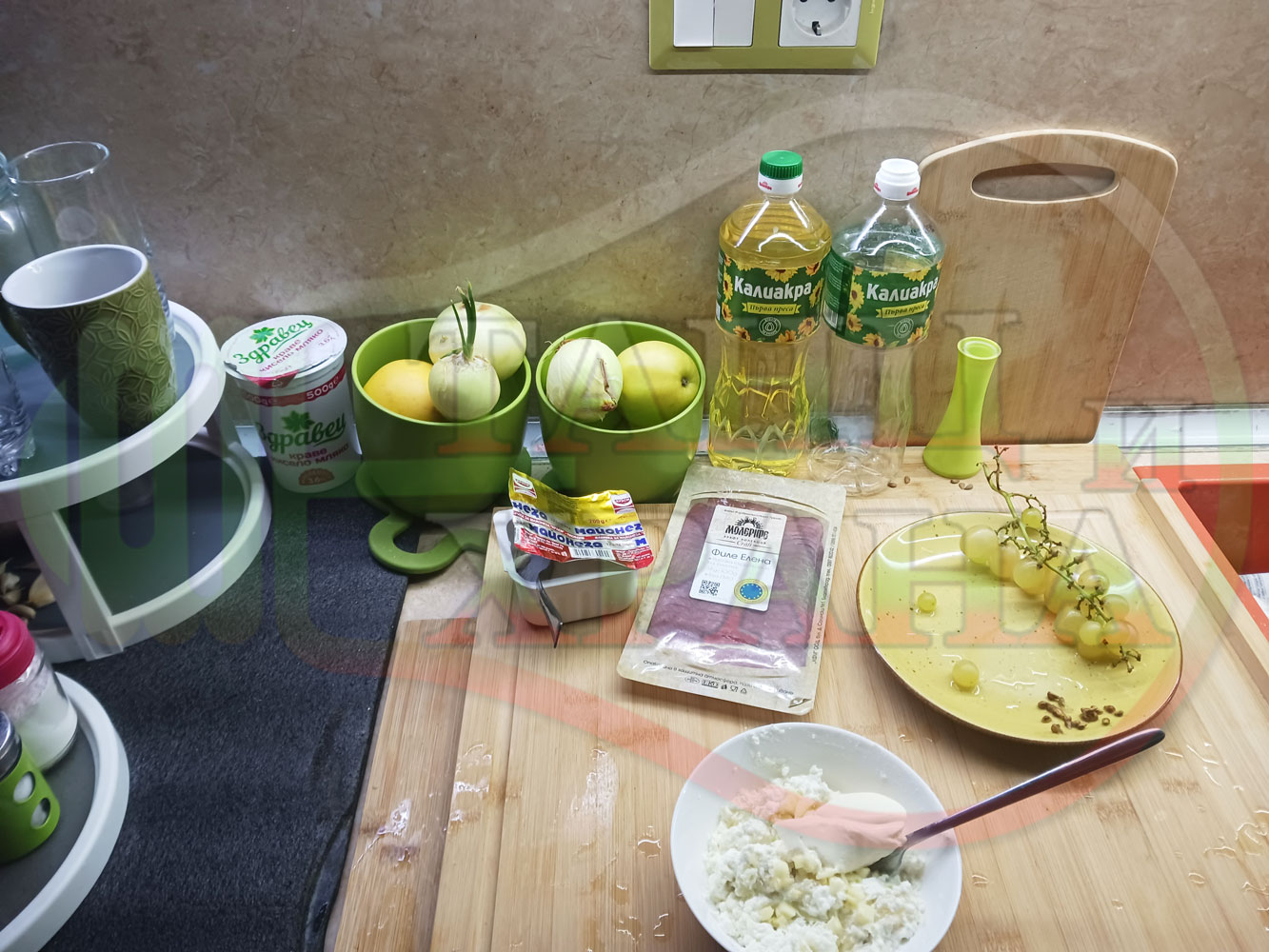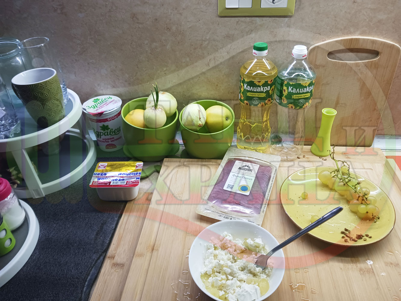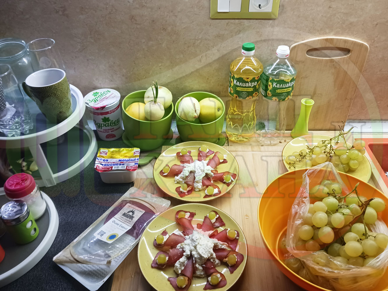 ПРОДУКТИ: Приблизителни количества за българска гроздова сурова салата "Филееленова майонезена с БГсирене" приготвена с прясно грозде, чесън, майонеза и краве бяло сирене (българско, саламурено) оформена като основа от сиренов крем гарнирана с филе елена - двукомпонентна