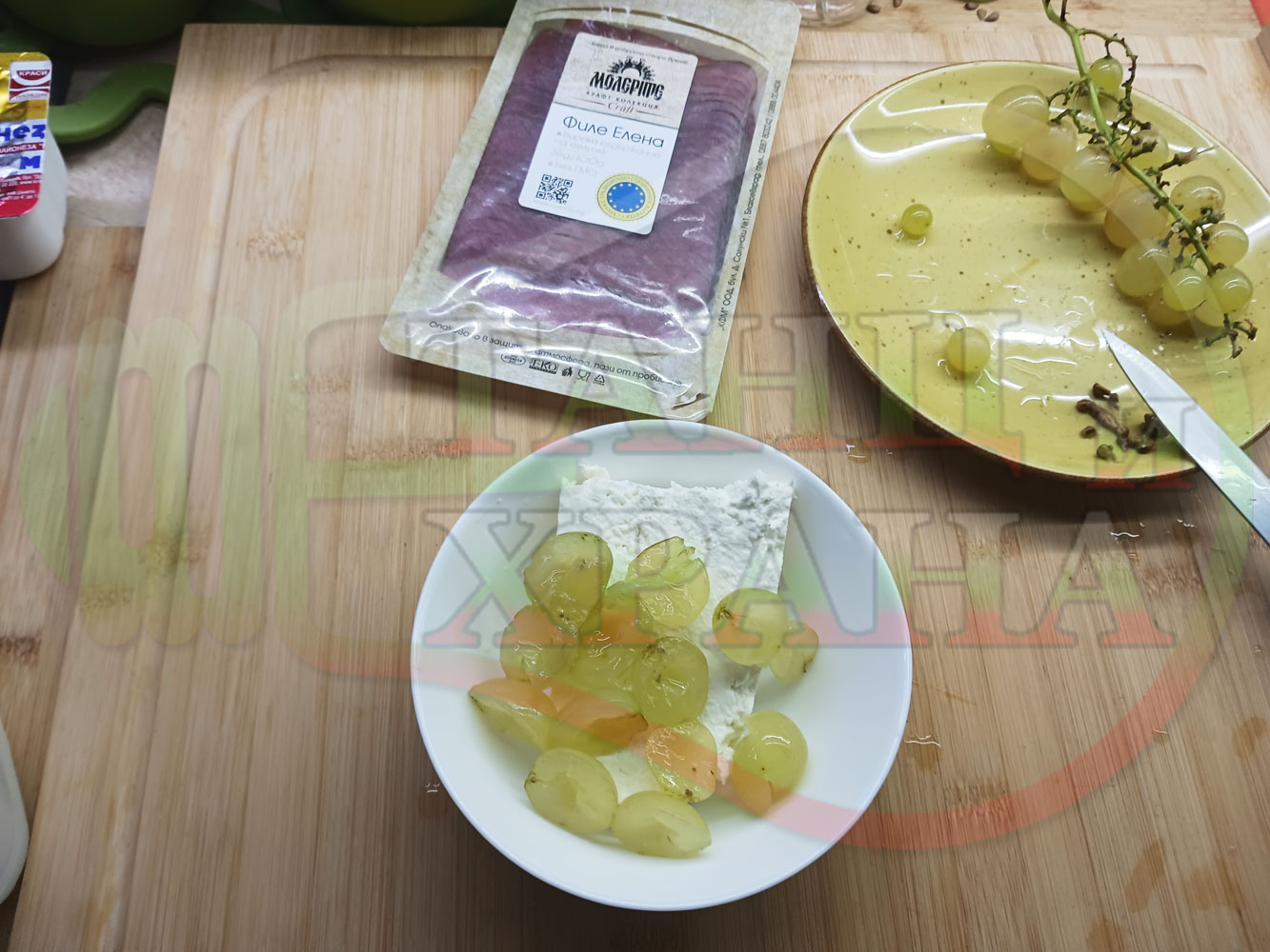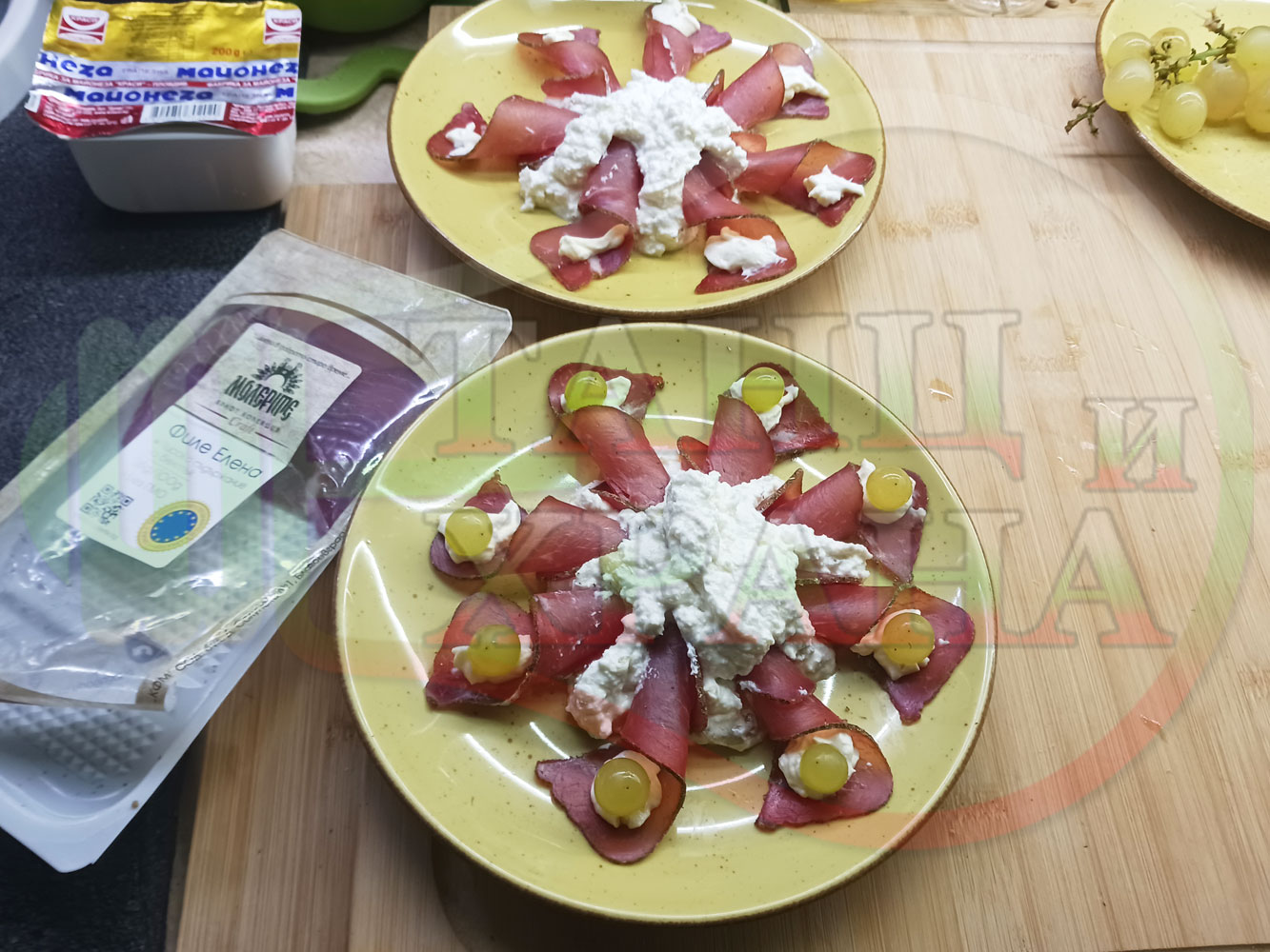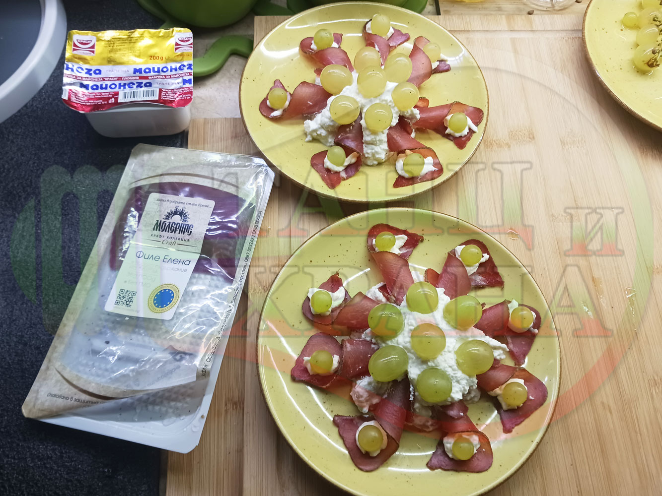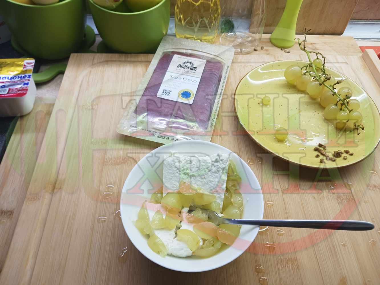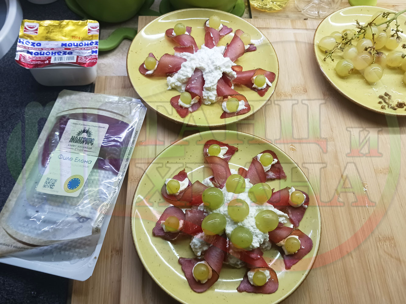 Българска гроздова сурова салата "Филееленова майонезена с БГсирене" приготвена с прясно грозде, чесън, майонеза и краве бяло сирене (българско, саламурено) оформена като основа от сиренов крем гарнирана с филе елена - двукомпонентна