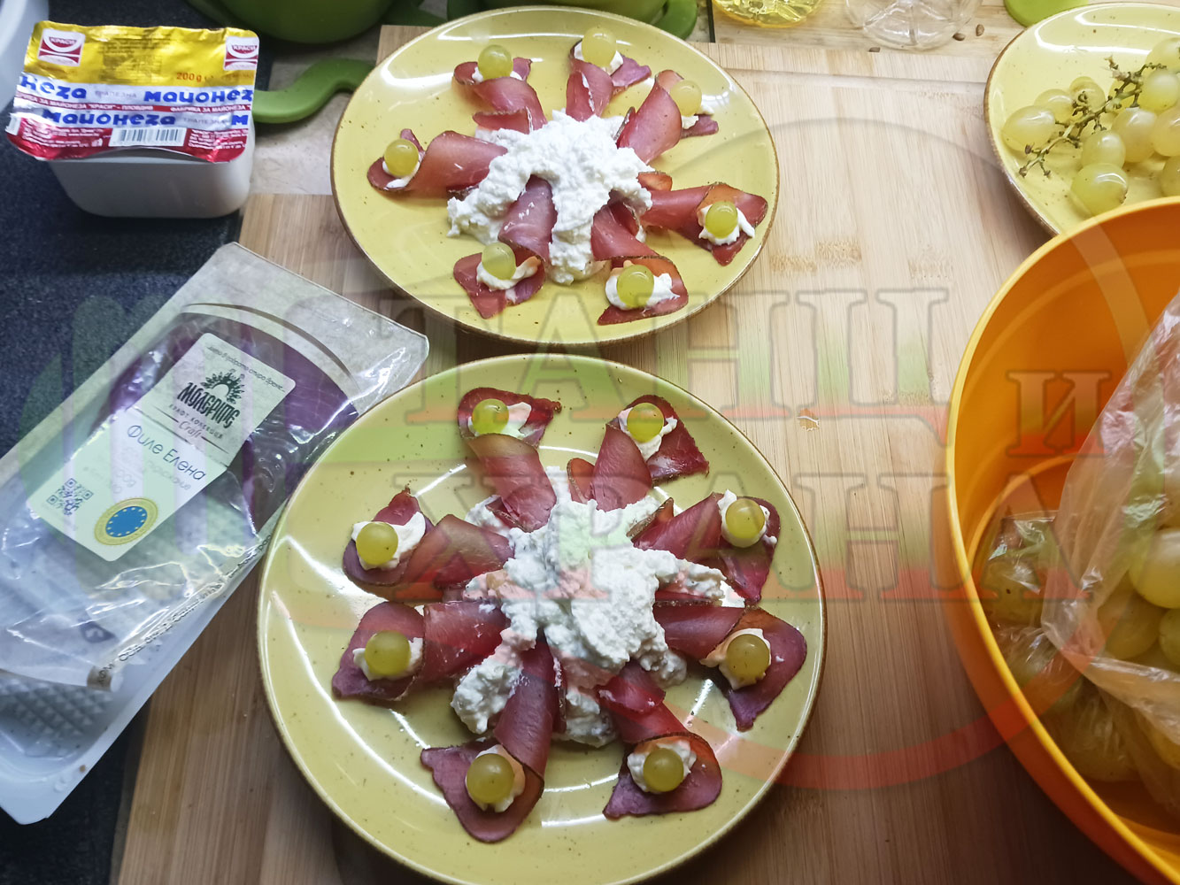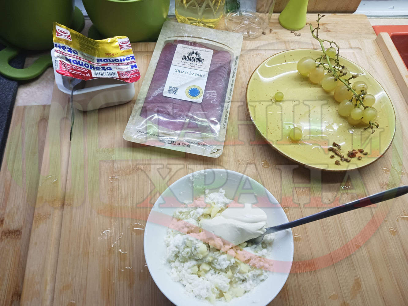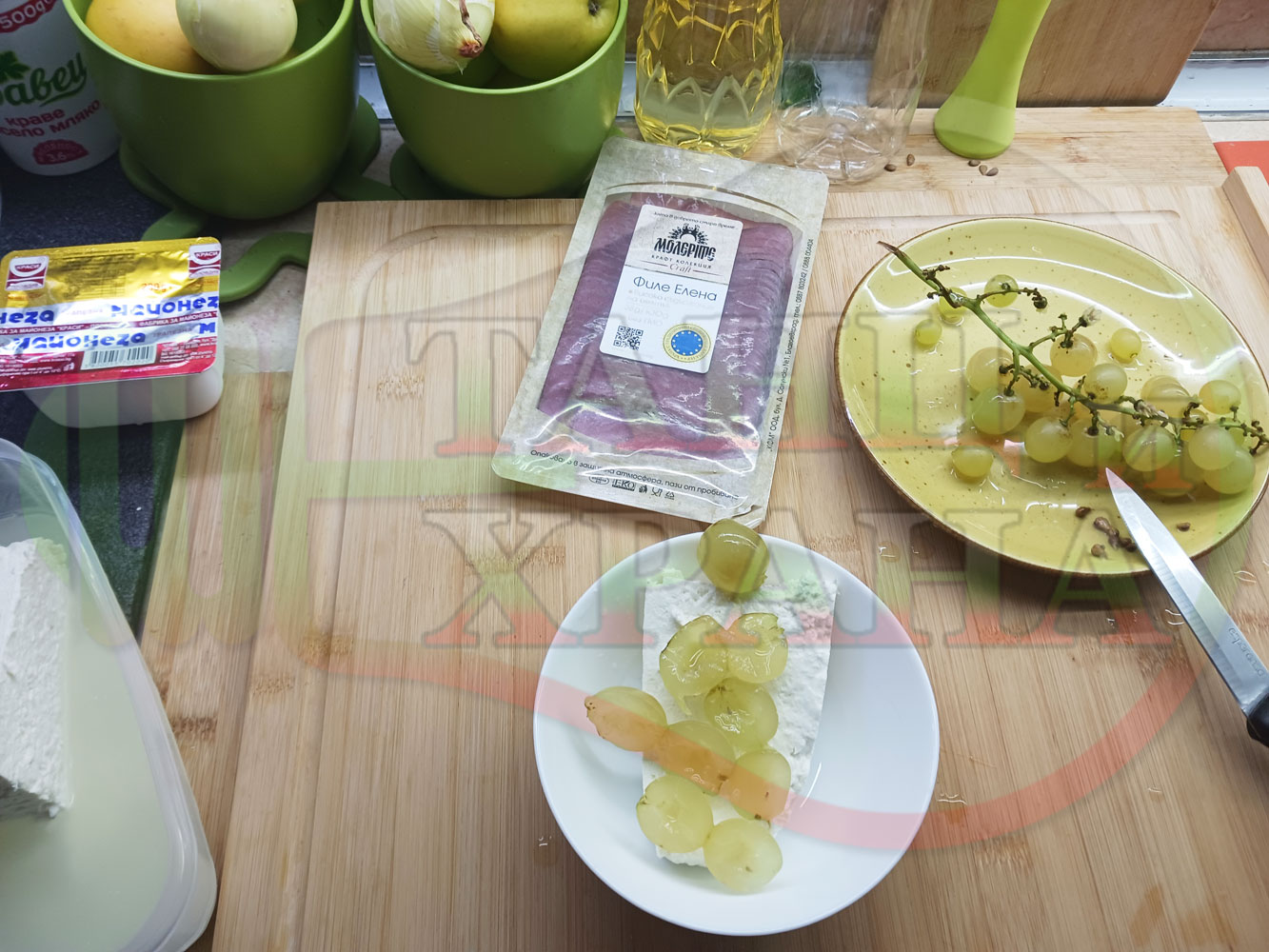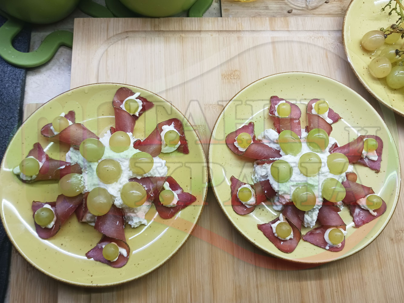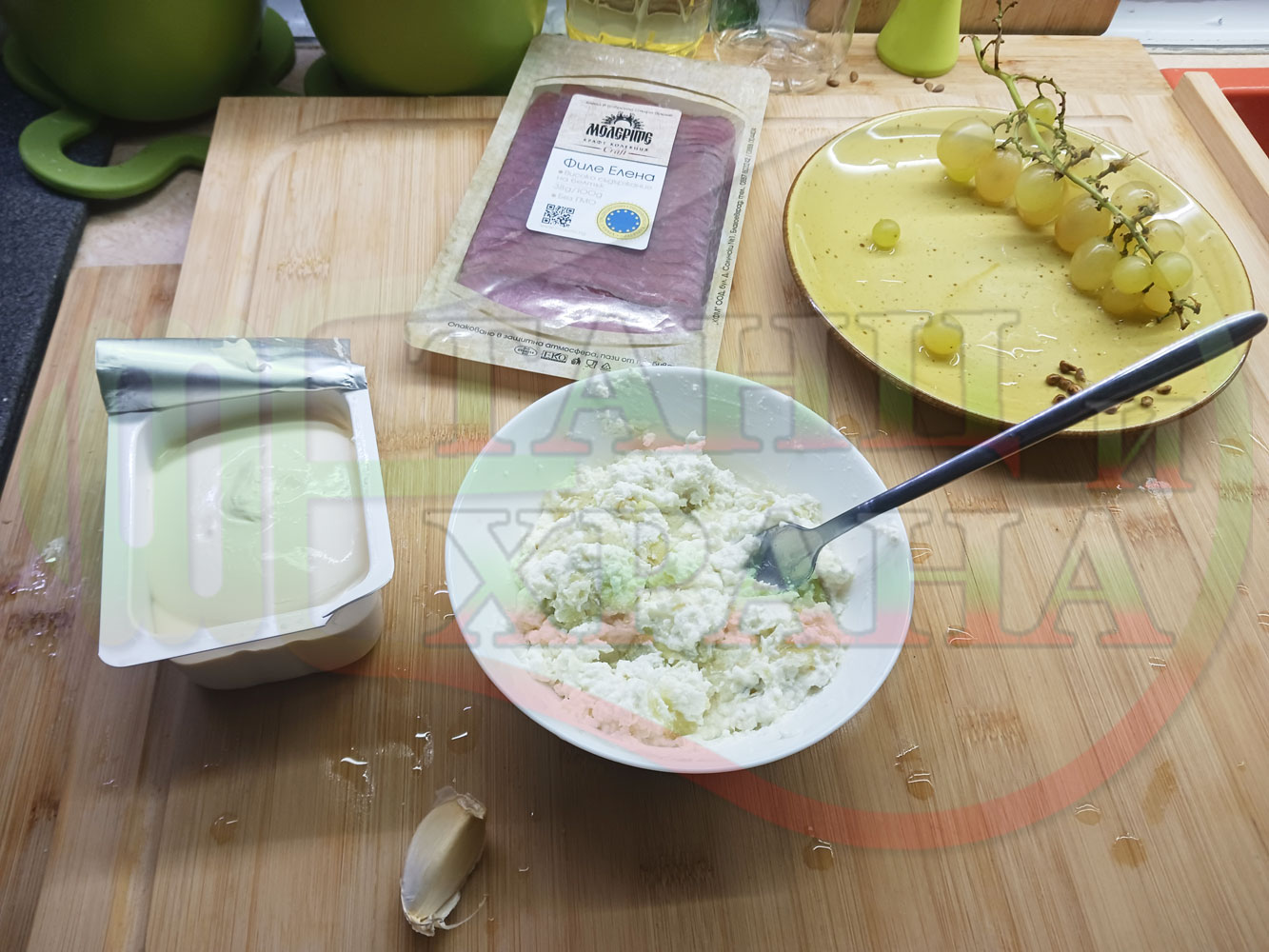 Българска гроздова сурова салата "Филееленова майонезена с БГсирене" приготвена с прясно грозде, чесън, майонеза и краве бяло сирене (българско, саламурено) оформена като основа от сиренов крем гарнирана с филе елена - двукомпонентна