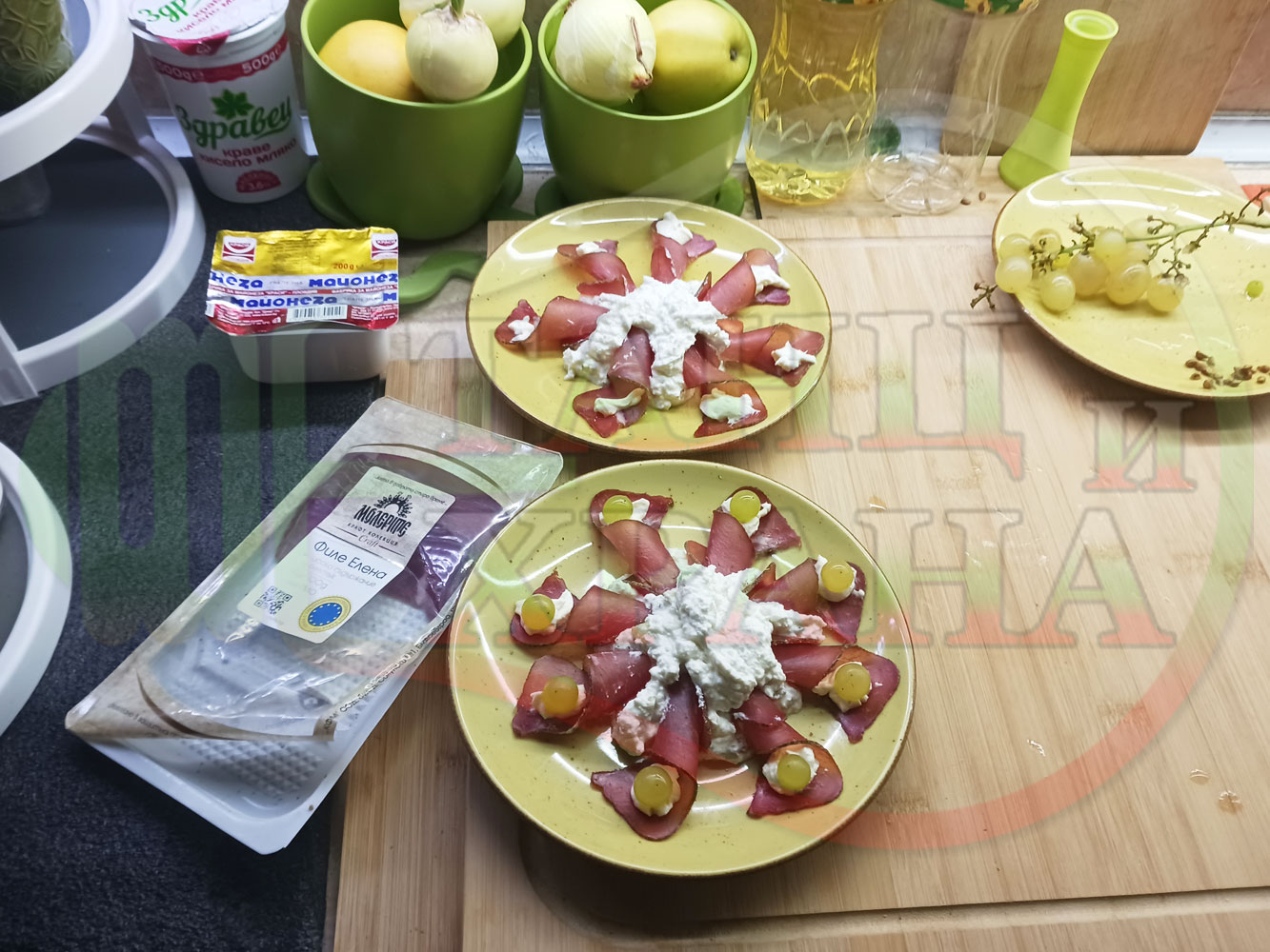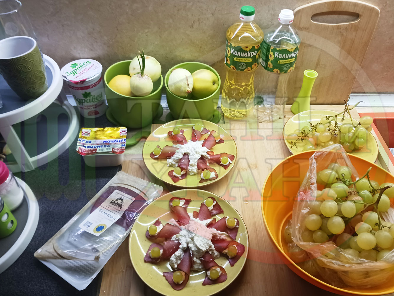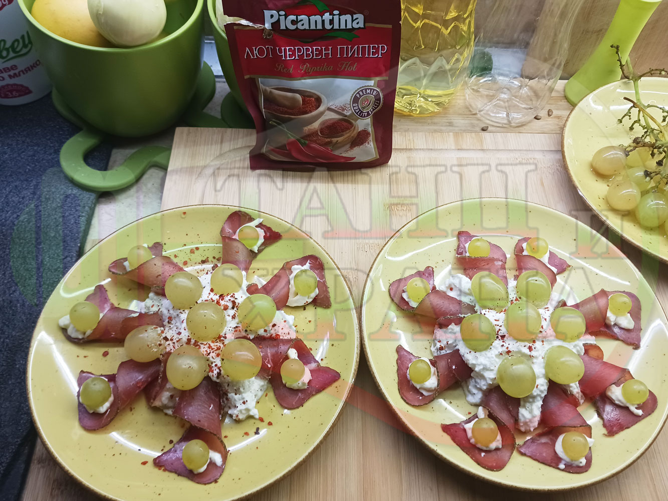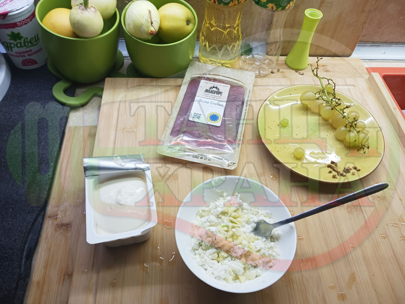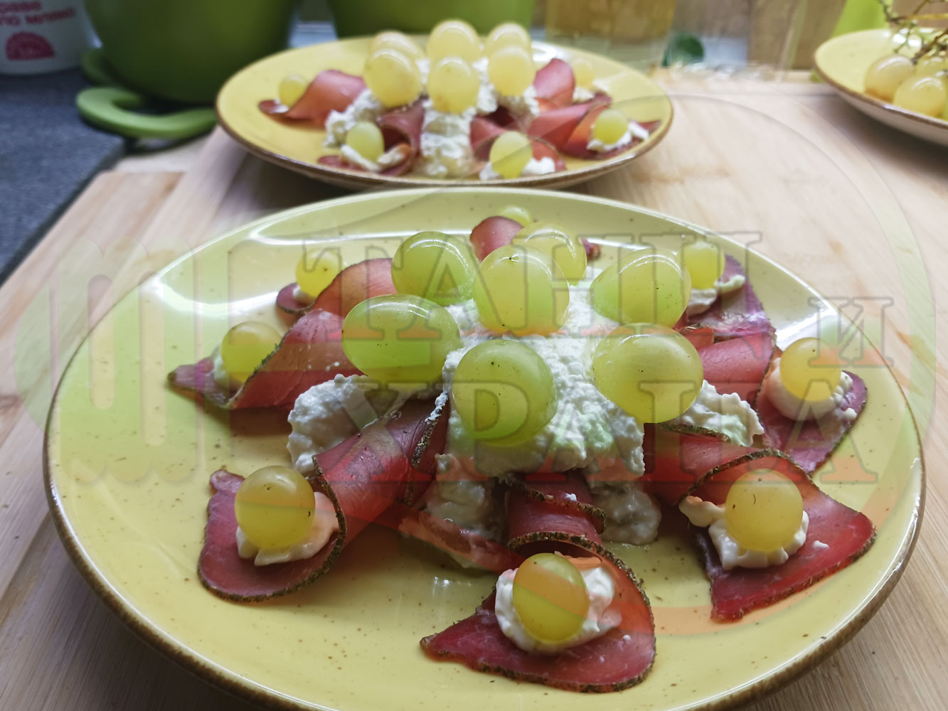 Българска гроздова сурова салата "Филееленова майонезена с БГсирене" приготвена с прясно грозде, чесън, майонеза и краве бяло сирене (българско, саламурено) оформена като основа от сиренов крем гарнирана с филе елена - двукомпонентна