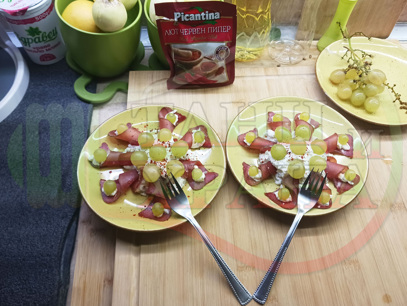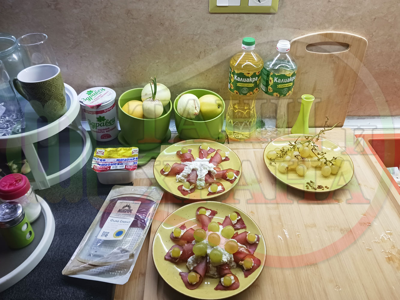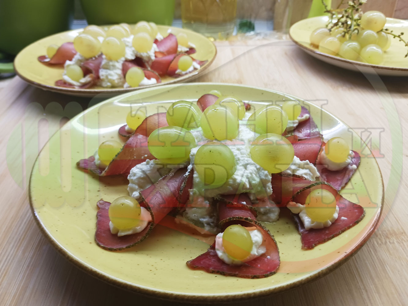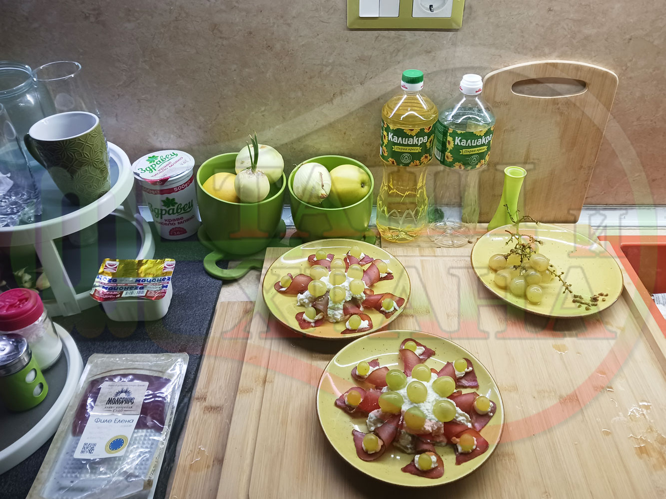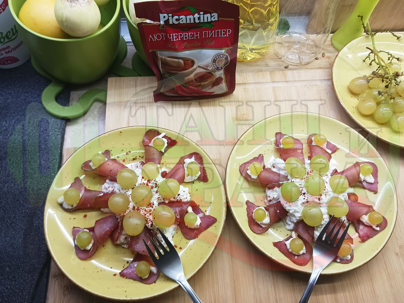 Българска гроздова сурова салата "Филееленова майонезена с БГсирене" приготвена с прясно грозде, чесън, майонеза и краве бяло сирене (българско, саламурено) оформена като основа от сиренов крем гарнирана с филе елена - двукомпонентна