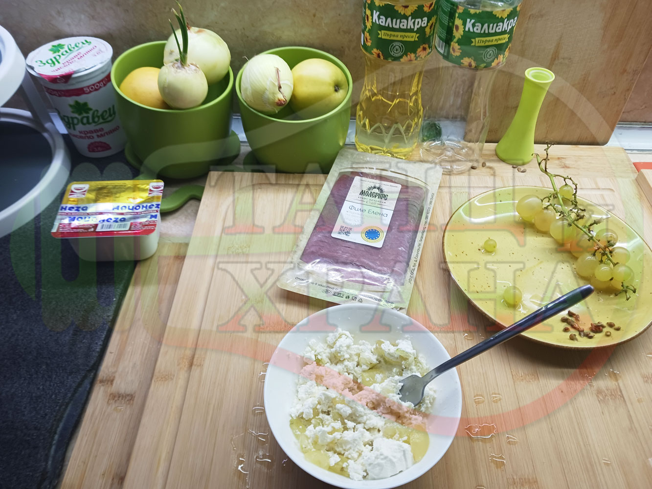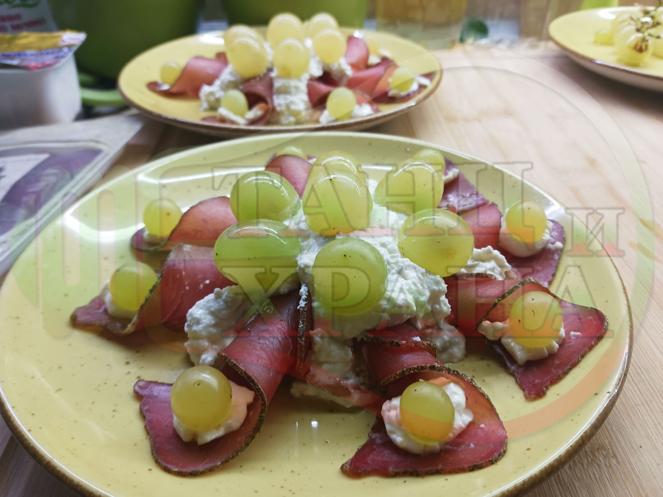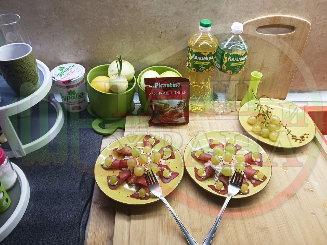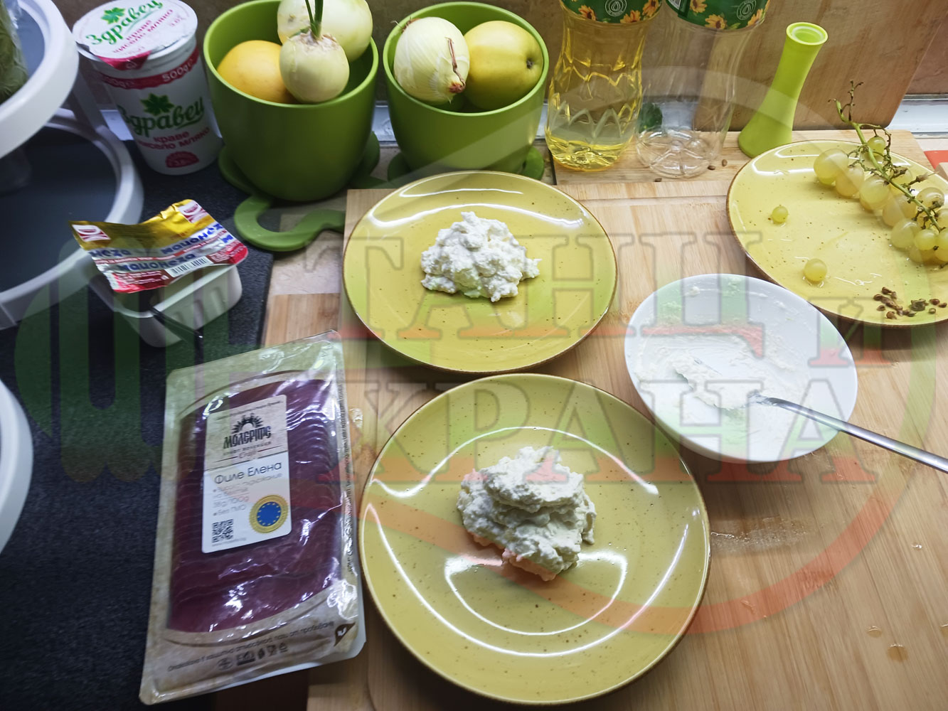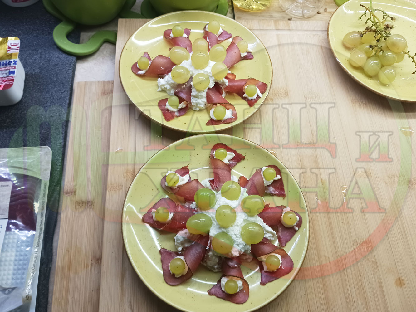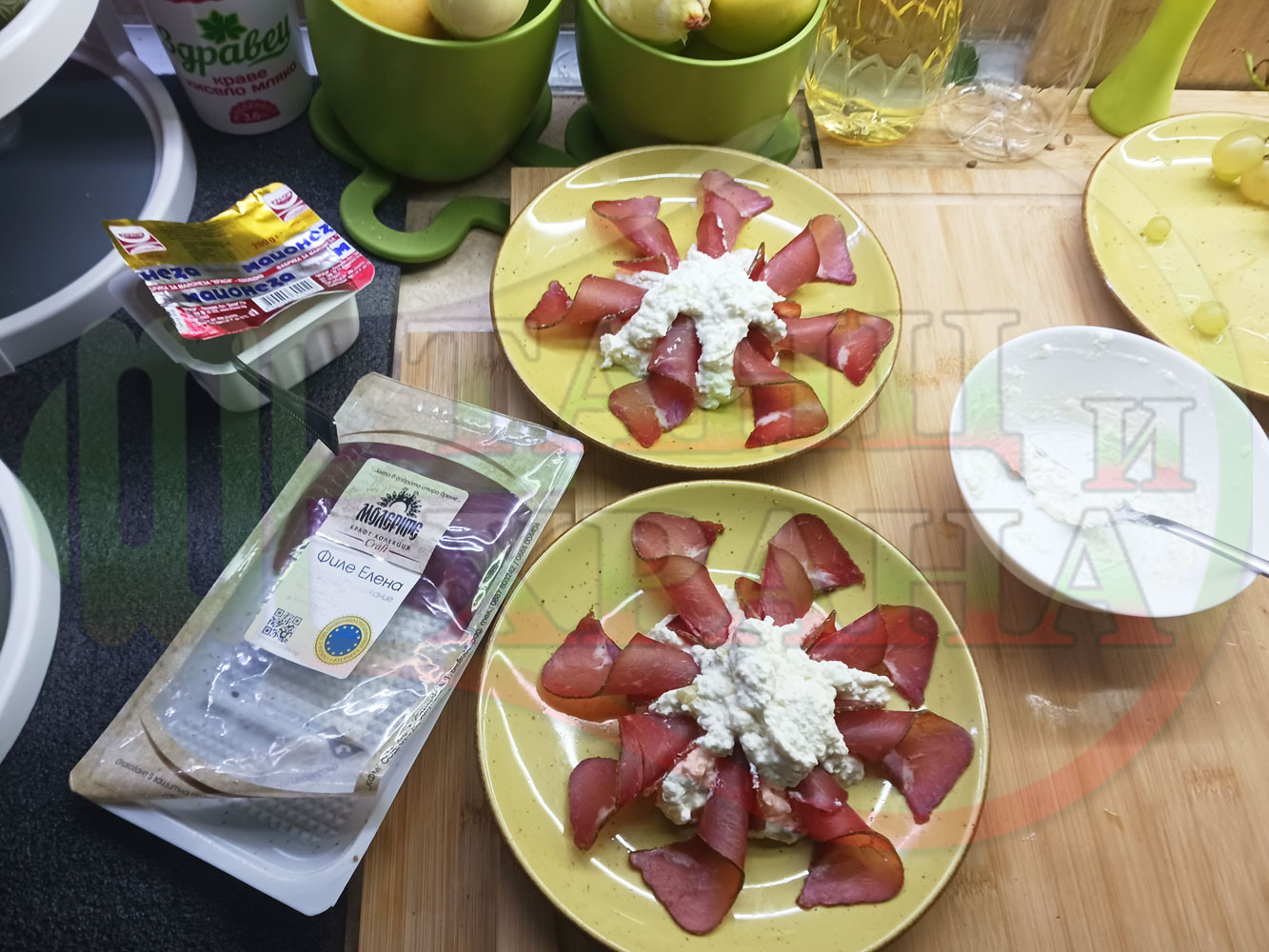Българска гроздова сурова салата "Филееленова майонезена с БГсирене" приготвена с прясно грозде, чесън, майонеза и краве бяло сирене (българско, саламурено) оформена като основа от сиренов крем гарнирана с филе елена - двукомпонентна