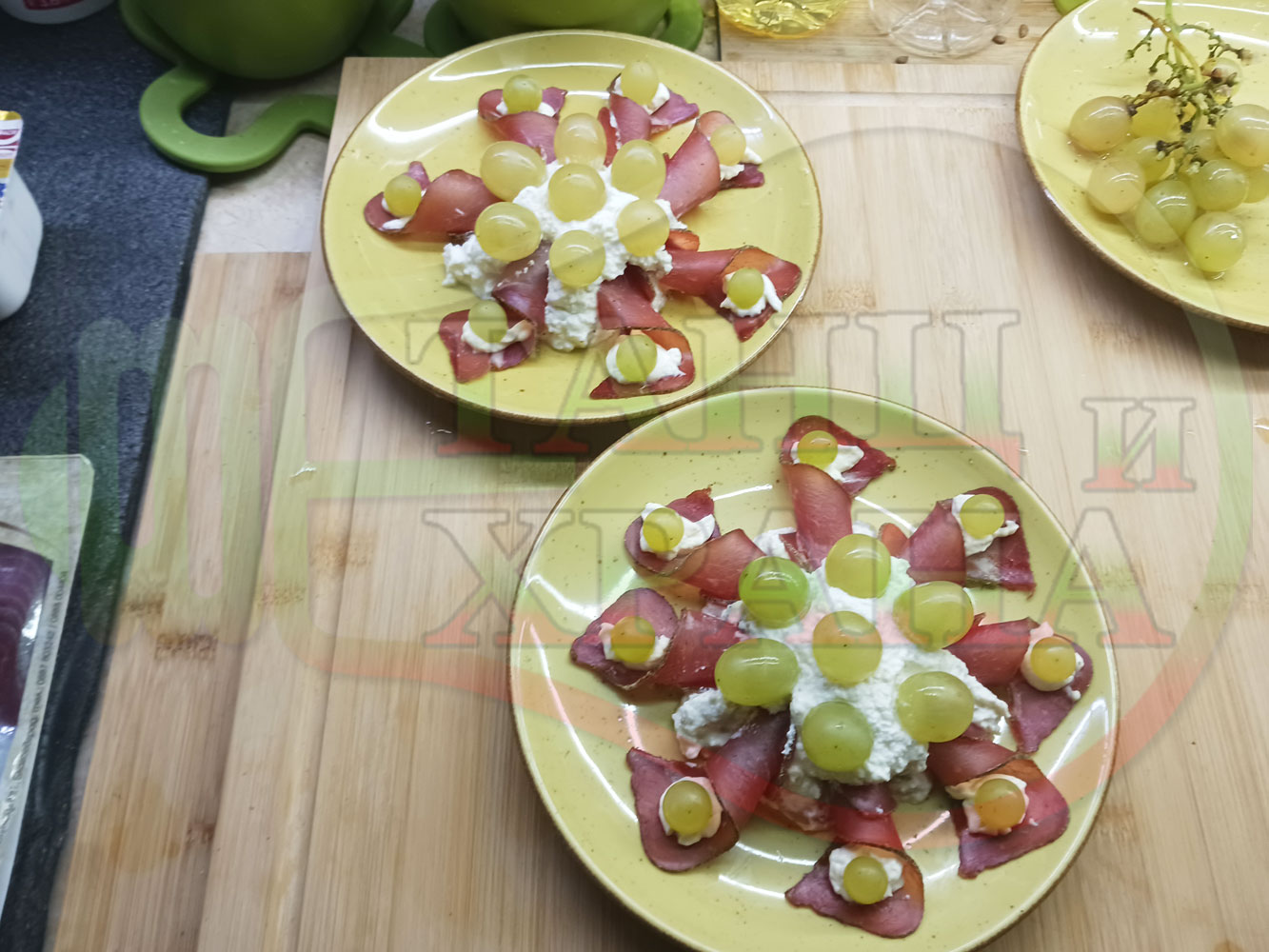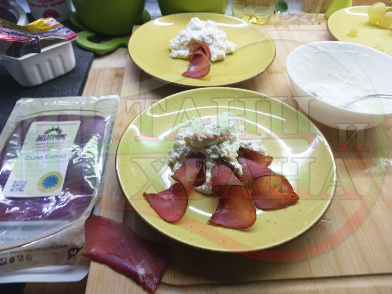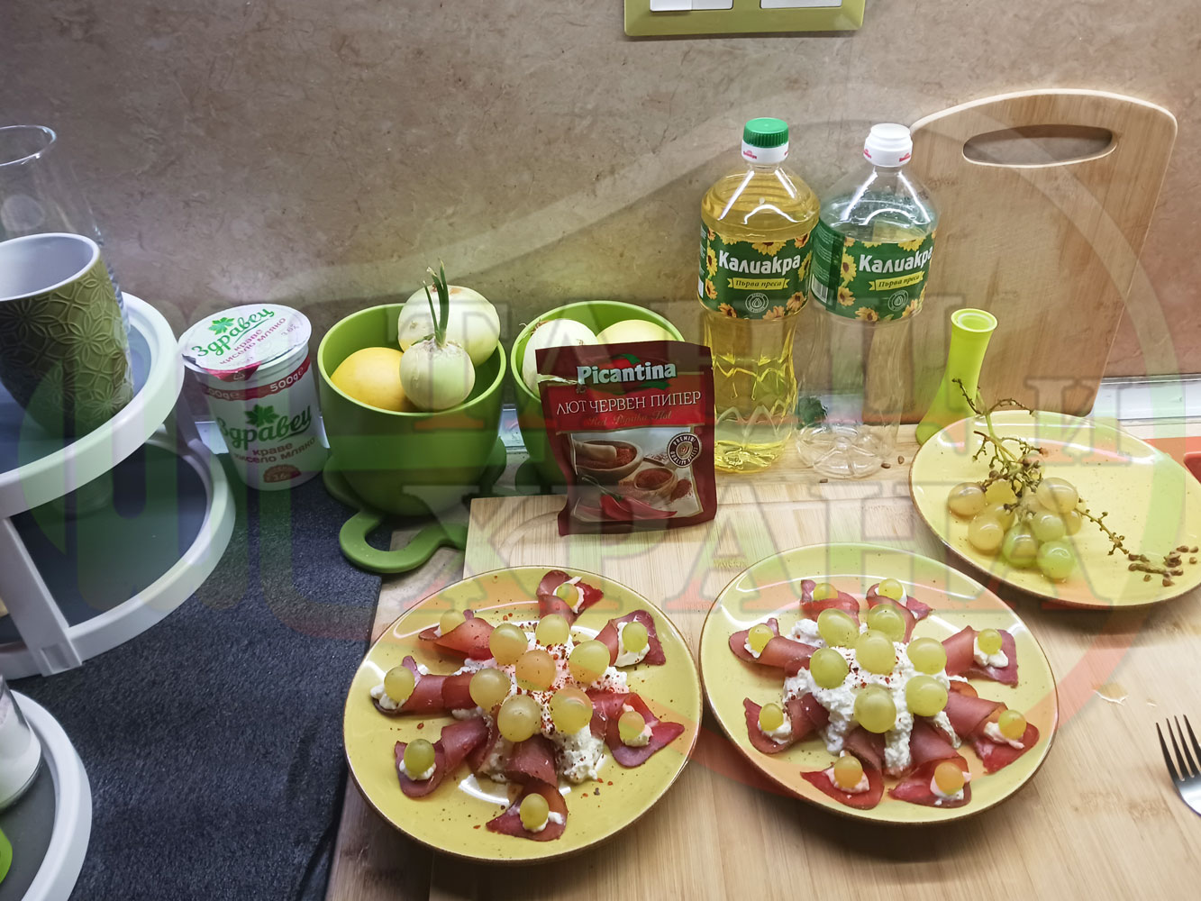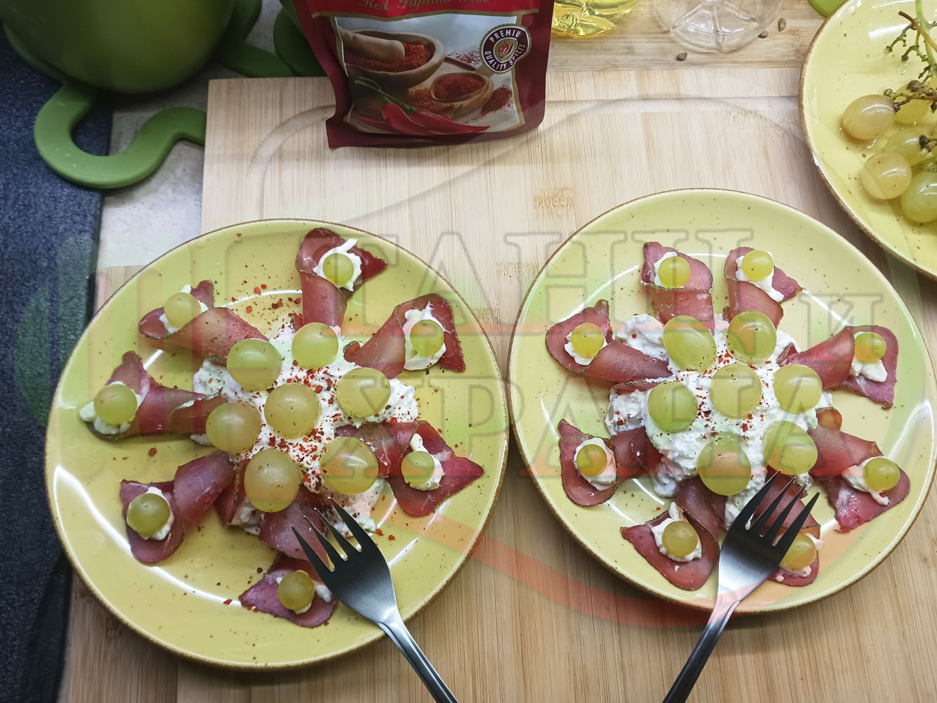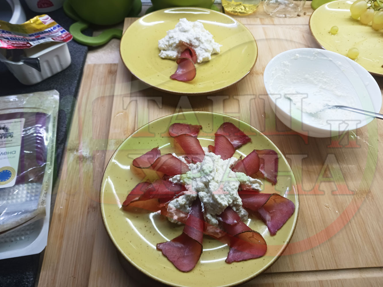 Българска гроздова сурова салата "Филееленова майонезена с БГсирене" приготвена с прясно грозде, чесън, майонеза и краве бяло сирене (българско, саламурено) оформена като основа от сиренов крем гарнирана с филе елена - двукомпонентна