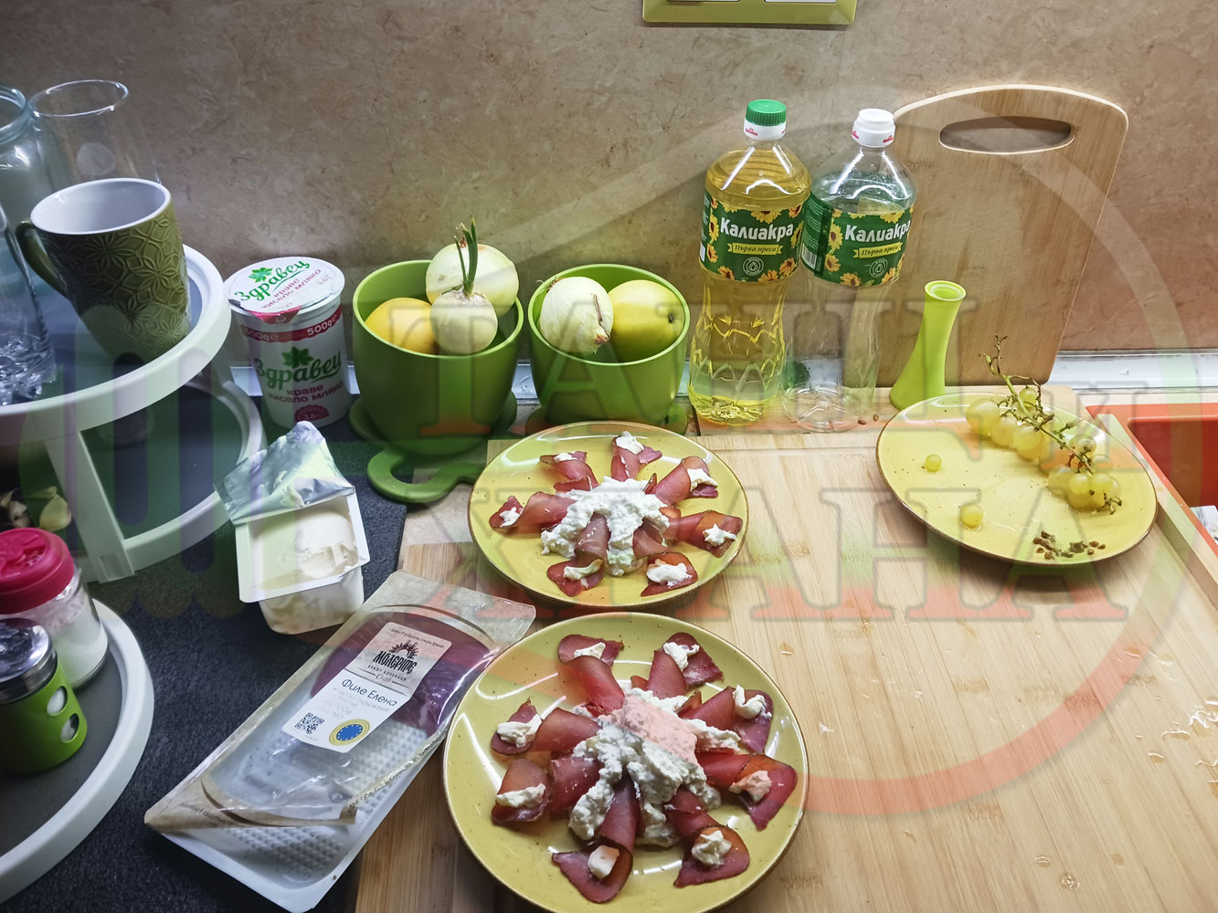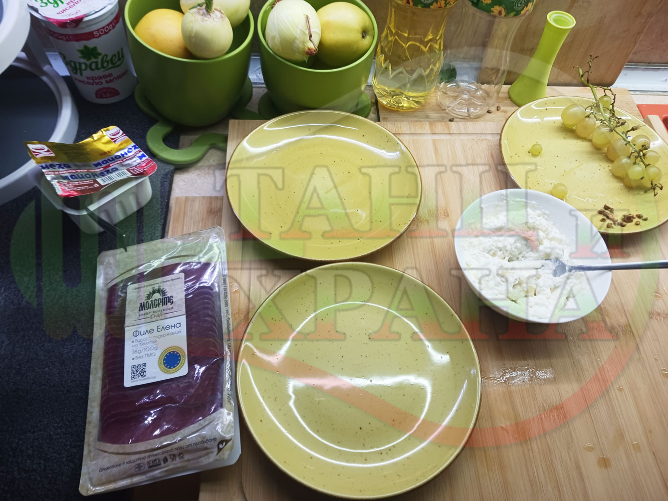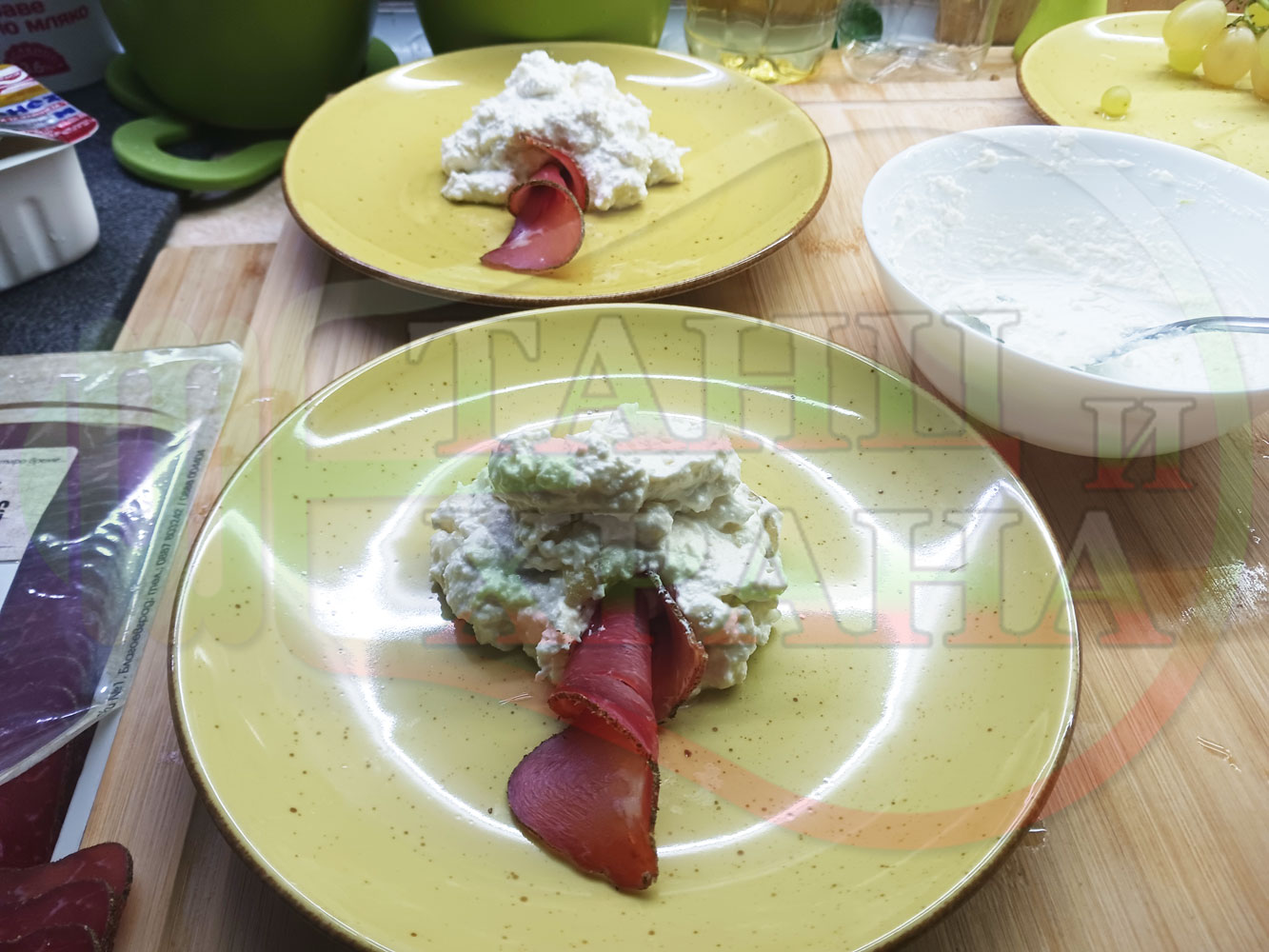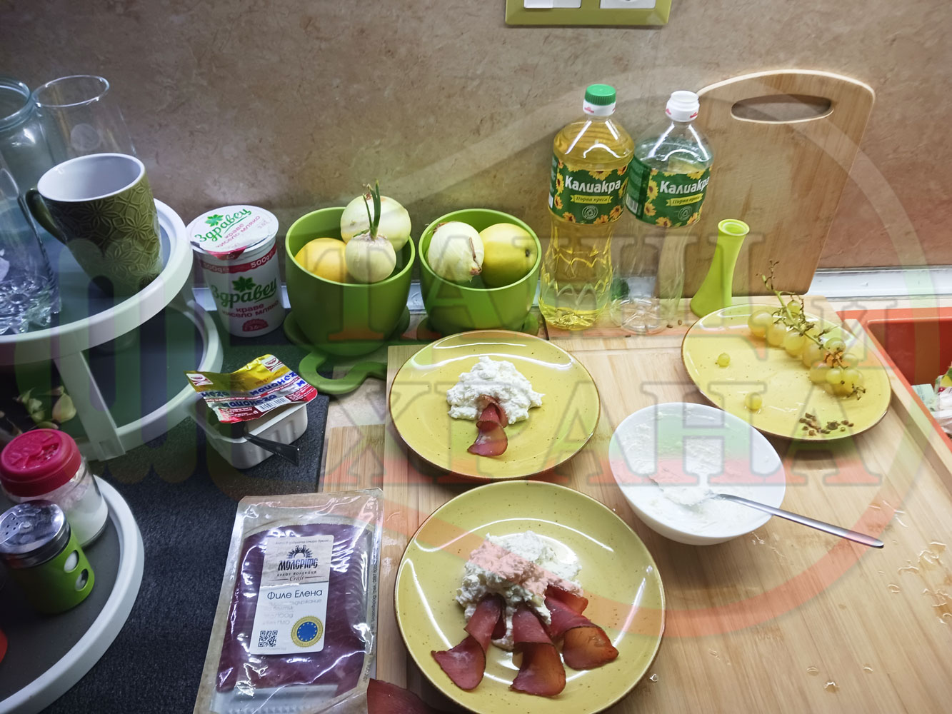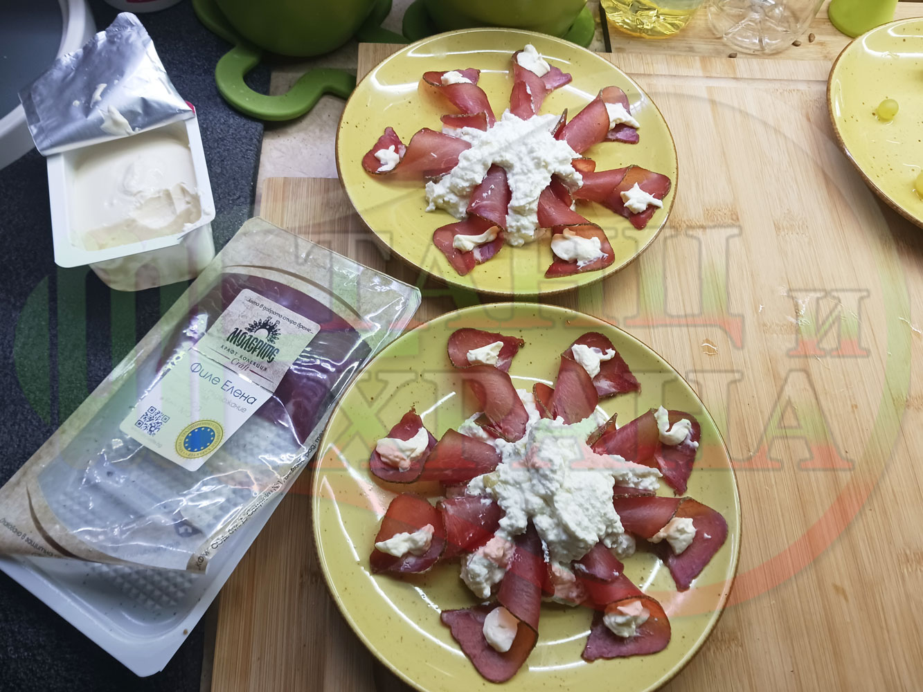 Българска гроздова сурова салата "Филееленова майонезена с БГсирене" приготвена с прясно грозде, чесън, майонеза и краве бяло сирене (българско, саламурено) оформена като основа от сиренов крем гарнирана с филе елена - двукомпонентна