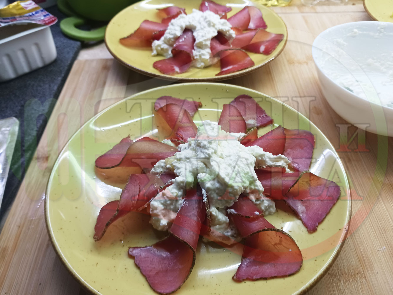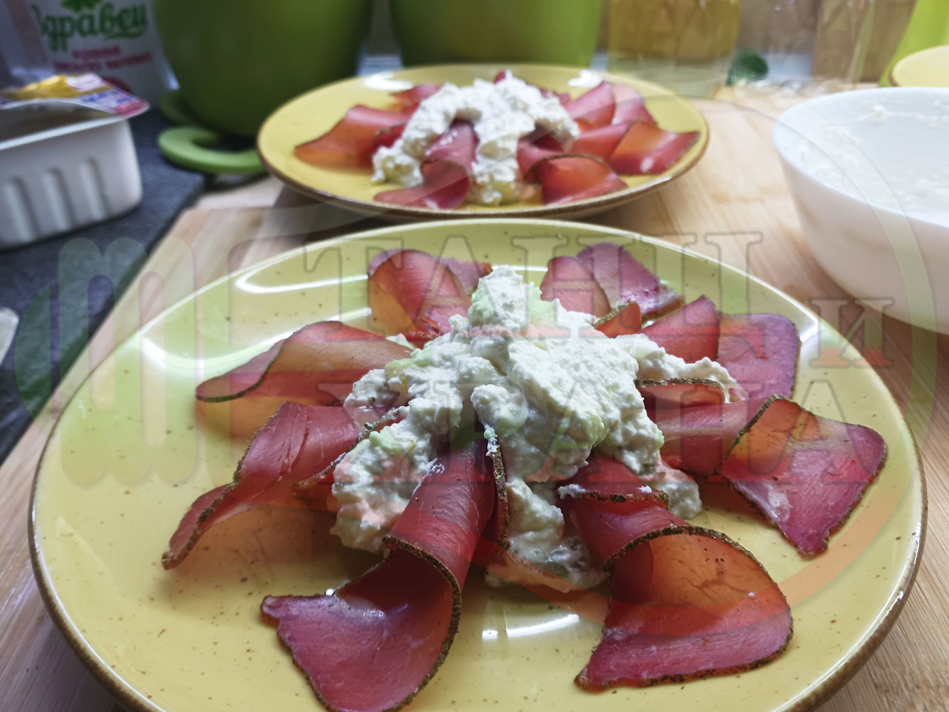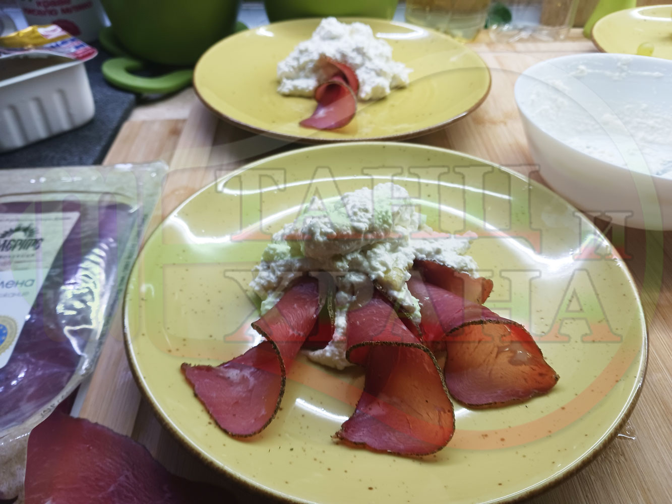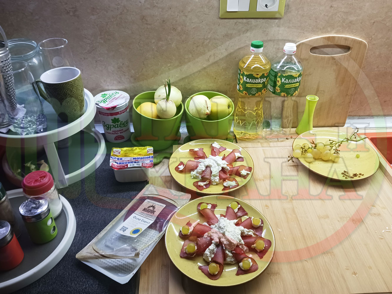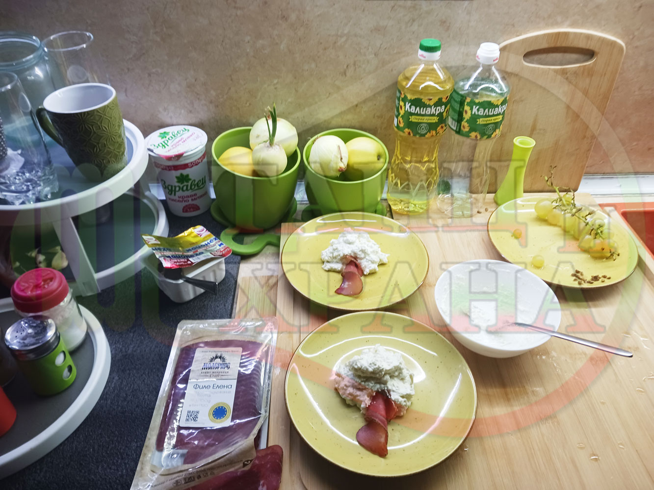 Българска гроздова сурова салата "Филееленова майонезена с БГсирене" приготвена с прясно грозде, чесън, майонеза и краве бяло сирене (българско, саламурено) оформена като основа от сиренов крем гарнирана с филе елена - двукомпонентна