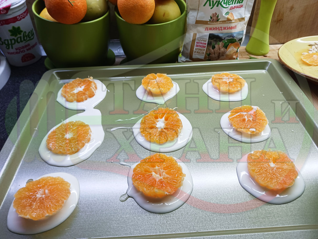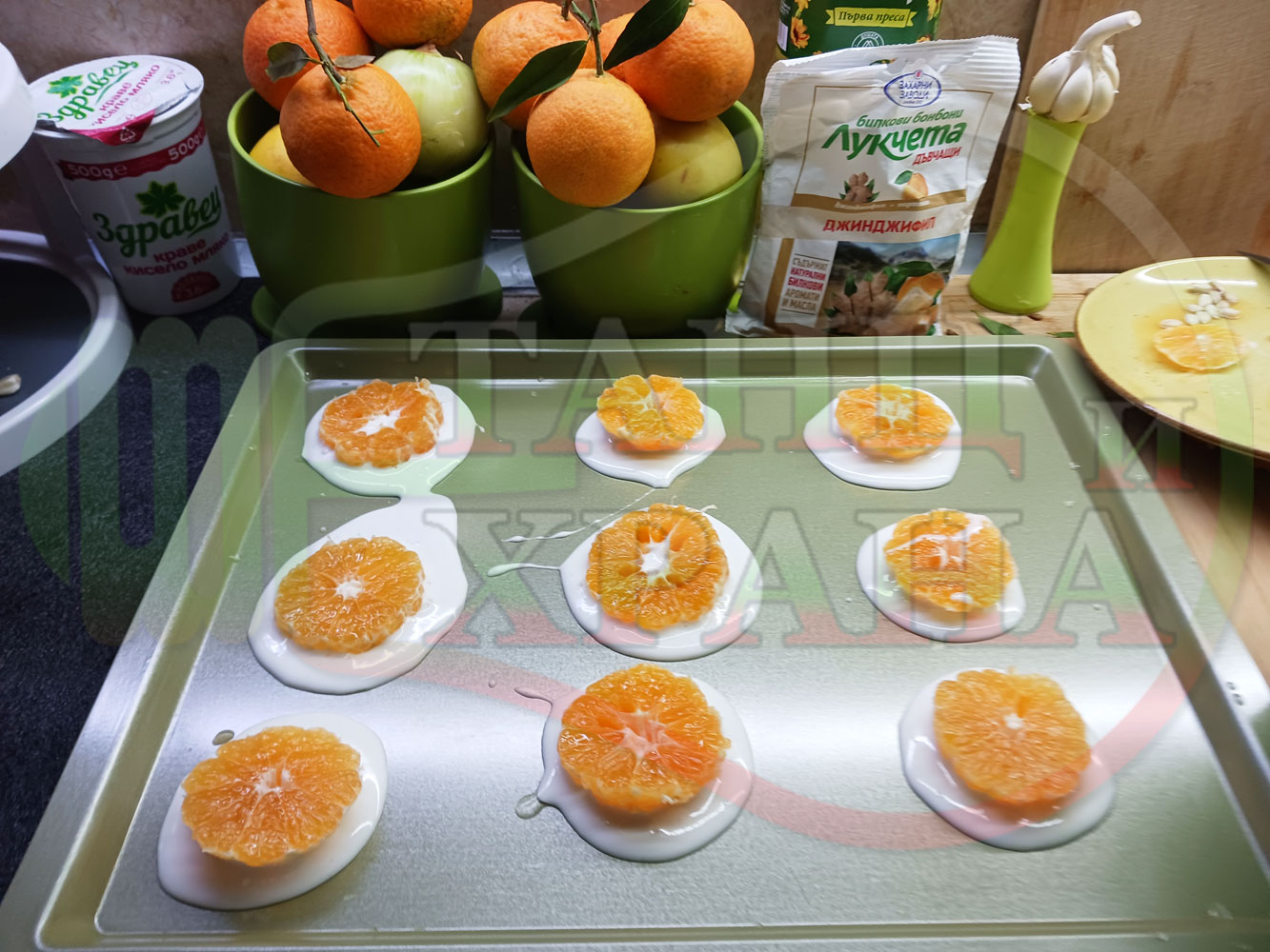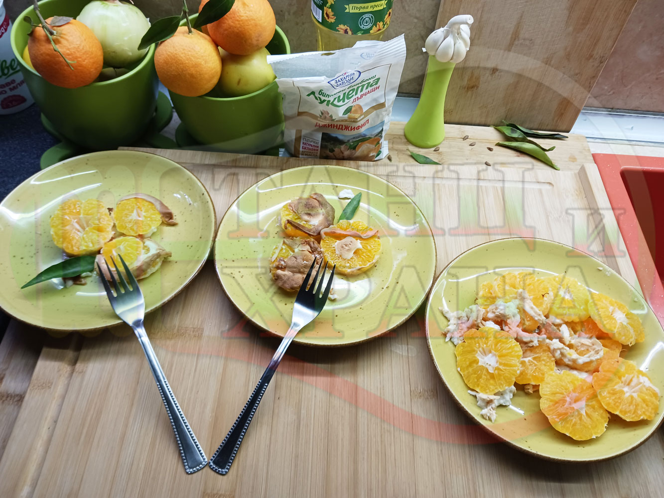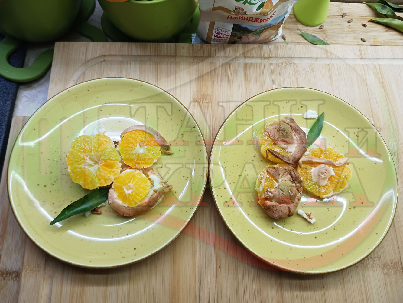 П. С. Листата на мандарината не са ядливи, горчат и ги поставяйте по-далече от мини плодовите десерти, без да се допират до мандарините за да не ги вгорчат.