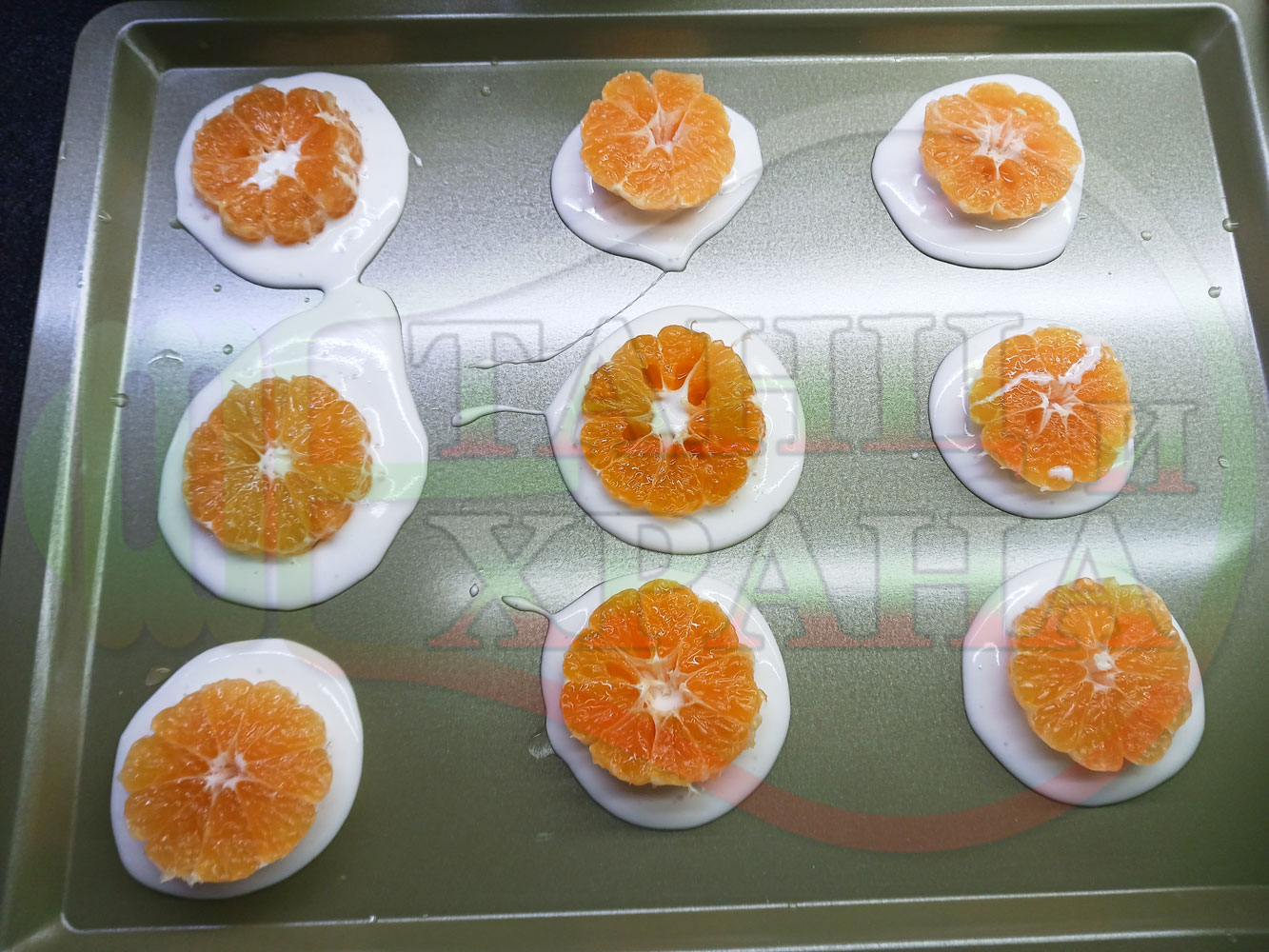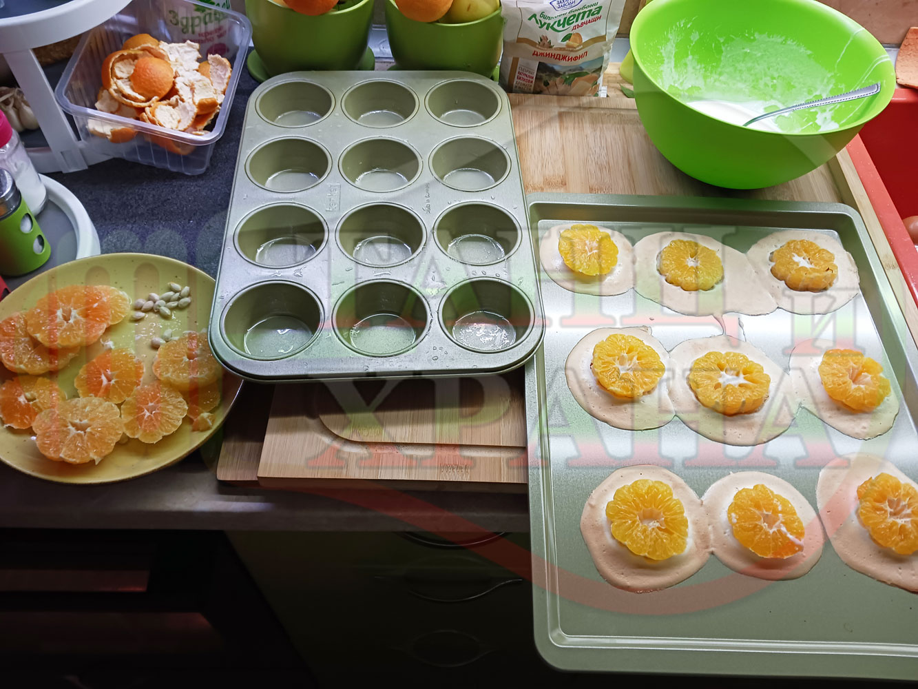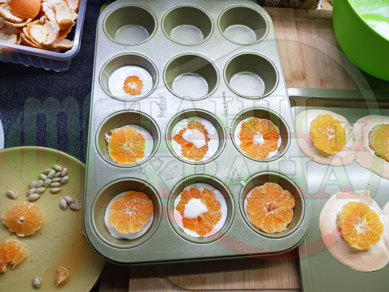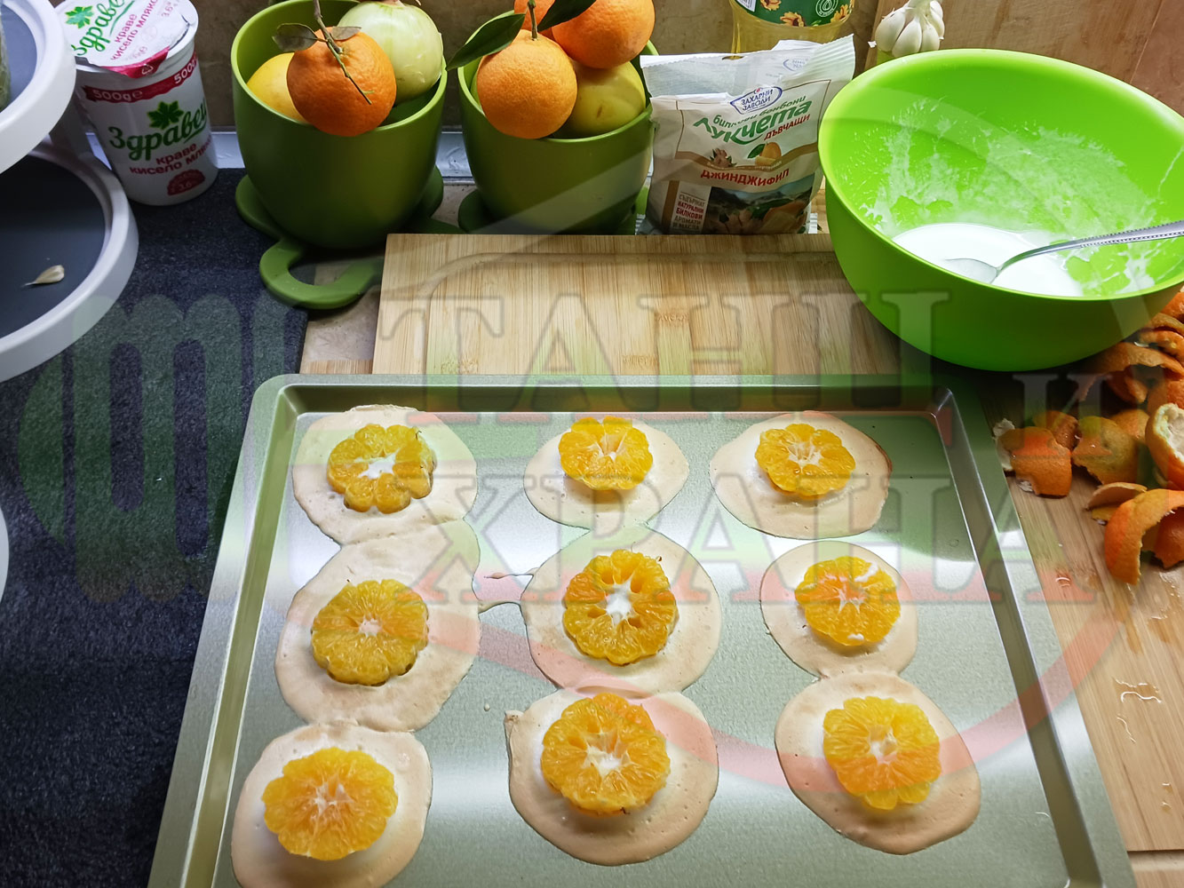 Сипете слънчогледово олио в тава за печене на курабии и във форма за печене на кексчета и размажте олиото равномерно. Измийте мандарините с гъба и веро, изплакнете ги хубаво, обелете ги и почистете от семките (измийте мандарините с веро, в случай че желаете да изсушите корите за приготвянето на различни сладкиши). Нарежете всяка мандарина на кръгли 3 части. Сипете по 1 супена лъжица от белтъчната смес в плоската тава и във формата за печене на кексове и поставете по 1 кръгче от нарязаните мандарини. Поставете тавата и формата за печене на кексове в предварително загрятата фурна (загрейте я за поне 5 минути). Запечете на фурна без вентилатор на 180 градуса за около 15 минути.