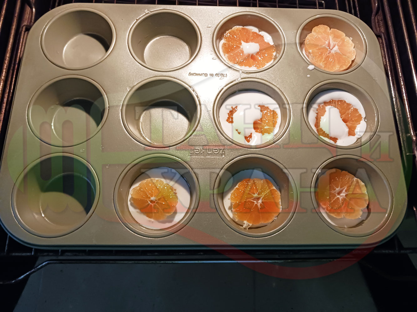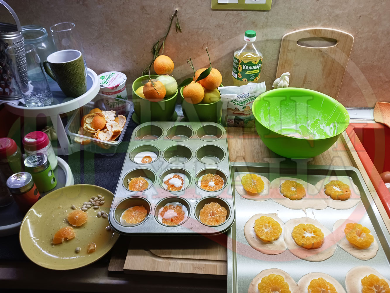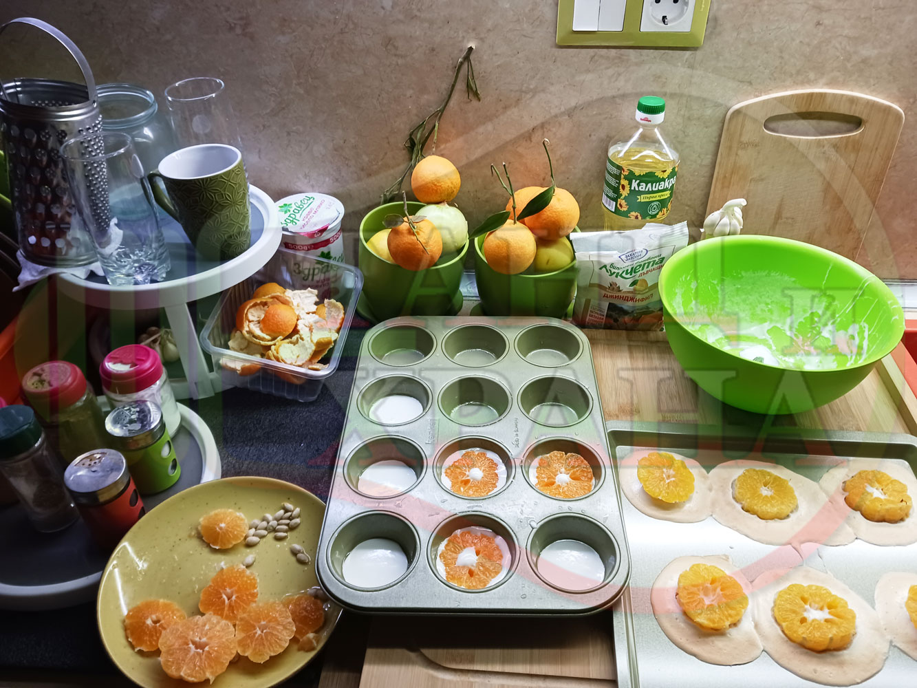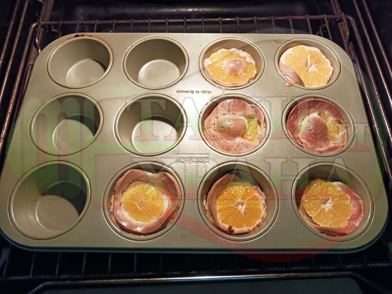 Сипете слънчогледово олио в тава за печене на курабии и във форма за печене на кексчета и размажте олиото равномерно. Измийте мандарините с гъба и веро, изплакнете ги хубаво, обелете ги и почистете от семките (измийте мандарините с веро, в случай че желаете да изсушите корите за приготвянето на различни сладкиши). Нарежете всяка мандарина на кръгли 3 части. Сипете по 1 супена лъжица от белтъчната смес в плоската тава и във формата за печене на кексове и поставете по 1 кръгче от нарязаните мандарини. Поставете тавата и формата за печене на кексове в предварително загрятата фурна (загрейте я за поне 5 минути). Запечете на фурна без вентилатор на 180 градуса за около 15 минути.
