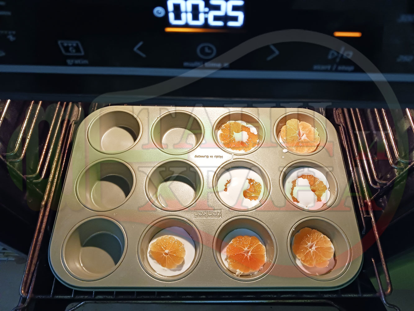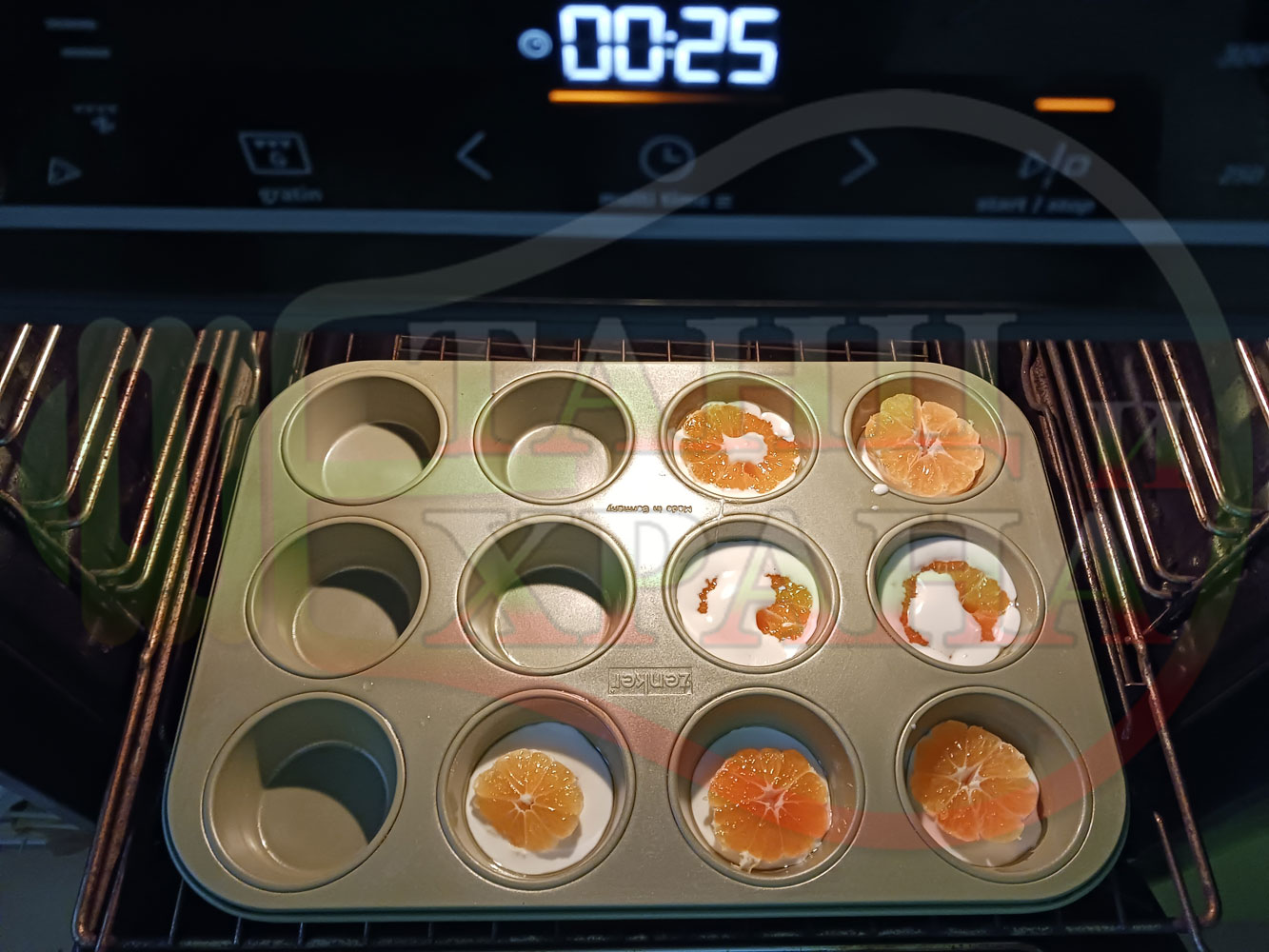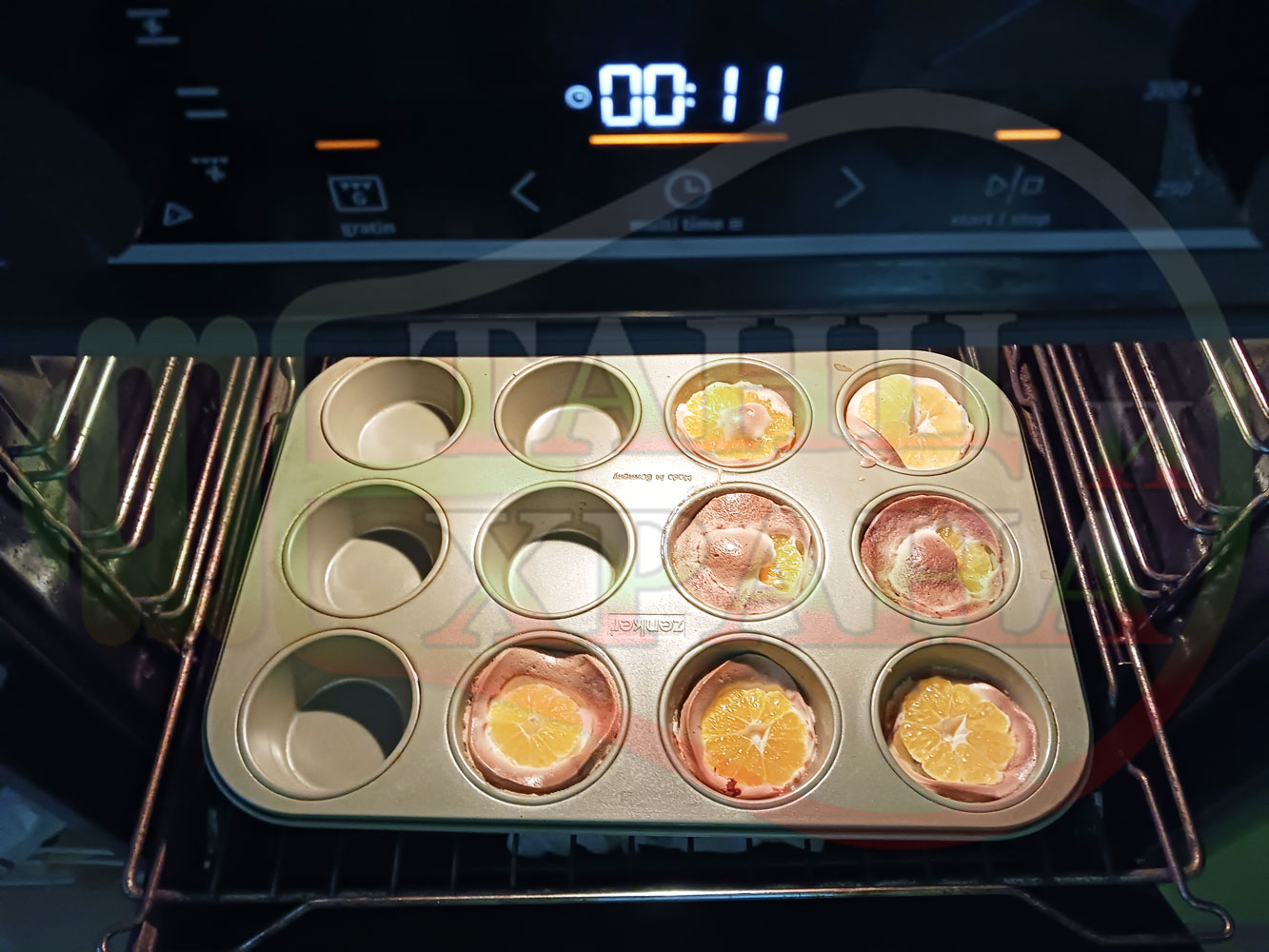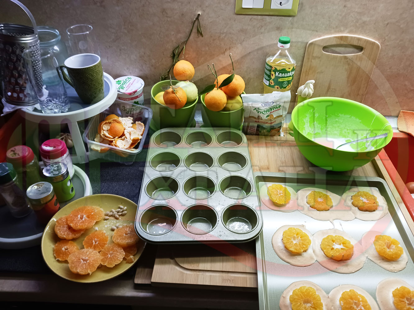 Сипете слънчогледово олио в тава за печене на курабии и във форма за печене на кексчета и размажте олиото равномерно. Измийте мандарините с гъба и веро, изплакнете ги хубаво, обелете ги и почистете от семките (измийте мандарините с веро, в случай че желаете да изсушите корите за приготвянето на различни сладкиши). Нарежете всяка мандарина на кръгли 3 части. Сипете по 1 супена лъжица от белтъчната смес в плоската тава и във формата за печене на кексове и поставете по 1 кръгче от нарязаните мандарини. Поставете тавата и формата за печене на кексове в предварително загрятата фурна (загрейте я за поне 5 минути). Запечете на фурна без вентилатор на 180 градуса за около 15 минути.